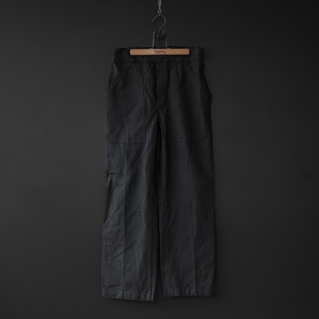 【国】 swiss military / スイス軍 【商品名】 80's swiss army late model denim pants (overdye) 80年代 スイス軍 後期型 デニム パンツ 後染め 【定価】 11,000円(税込) 【商品説明】 スイス軍が1980年代頃に採用していたデニムワークパンツを黒染め。 フロントはベイカーパンツの様な大きなポケットが付き、両サイドには貫通ポケットも設けられています。 バックポケットは片ポケで、右下には縦長のポケットも付きます。 ボタンフライ仕様。 ヘビーオンスながら後染めによりかなり柔らかくなっており履きやすいです。 ※その他[ミリタリーアイテム]はこちら https://www.drosdro.jp/categories/5691535 【サイズ】 ウエスト : 〜88cm(ウエスト後ろにゴム入り) 股上 : 33cm 股下 : 76.5cm 総丈 : 110cm 裾幅 : 24cm ※平置き採寸ですので多少の誤差はご了承ください。 ※ご覧になるディスプレイによって色合いが異なることがありますが、ご容赦くださいますようお願いいたします。 ※実店舗、他サイトでも販売している為、在庫の変動がある場合がございます。何卒ご容赦くださいますようお願い致します。 ※当店で売り切れの場合も、メーカーに在庫の確認をしますのでお気軽にお申し付けくださいませ。 ※佐川急便以外の配送方法は日時指定が行えませんので予めご了承くださいませ。 ※レターパックをご選択いただいた際、内容物の量により佐川急便に変更することがございます。当店都合の配送方法変更の場合、送料の差額は当店で負担いたしますのでご安心くださいませ。 ※古着と踏まえた上でご検討くださいますようお願い申し上げます。