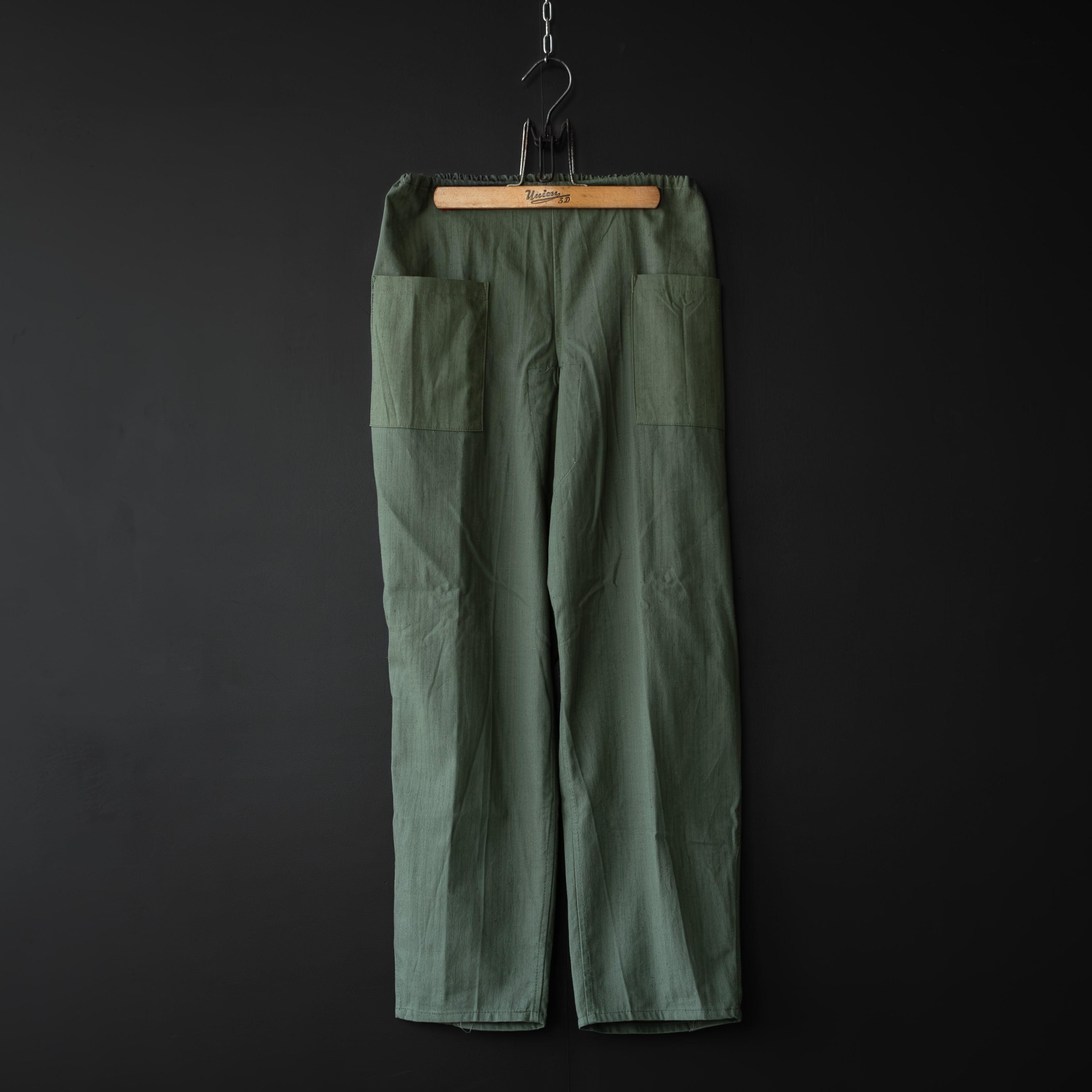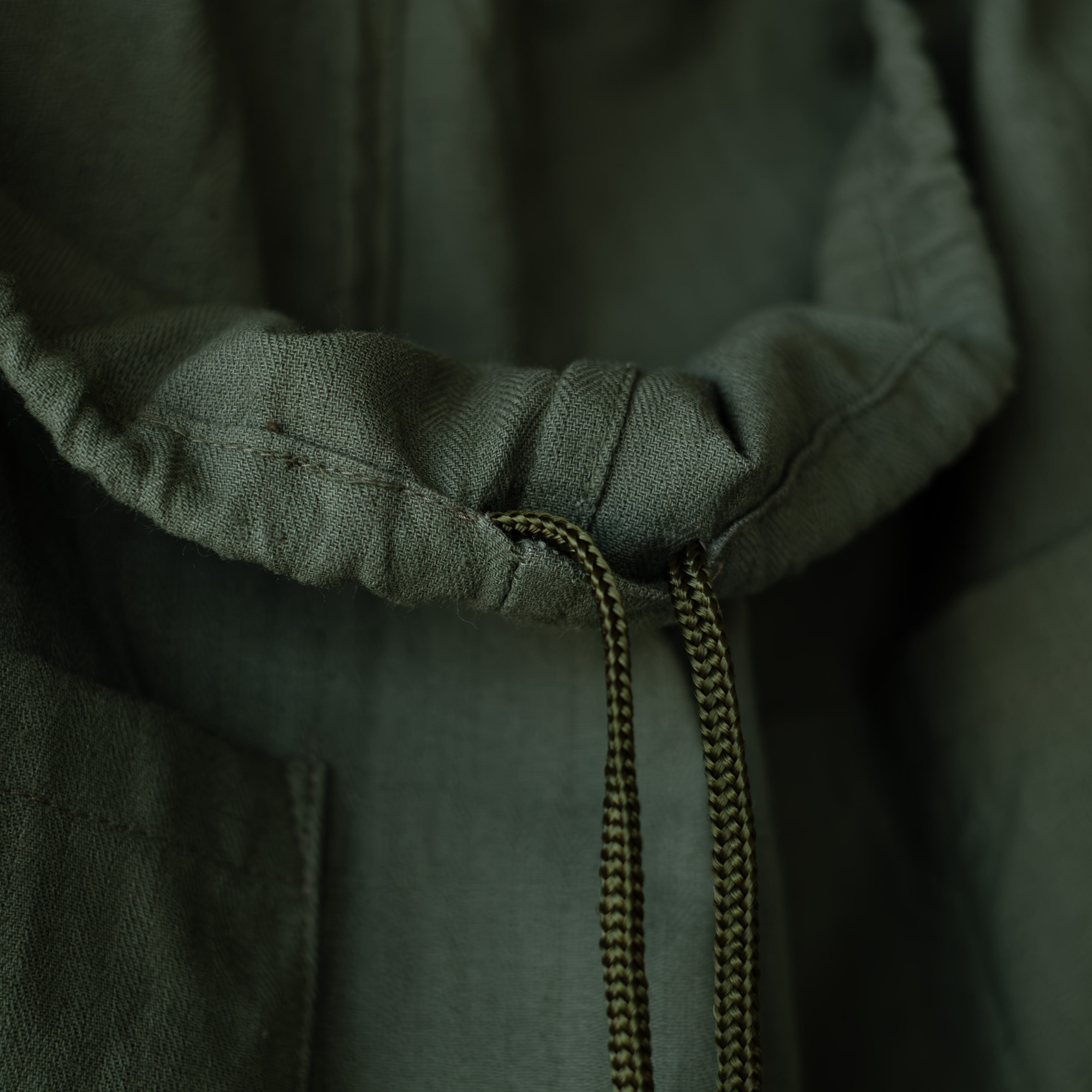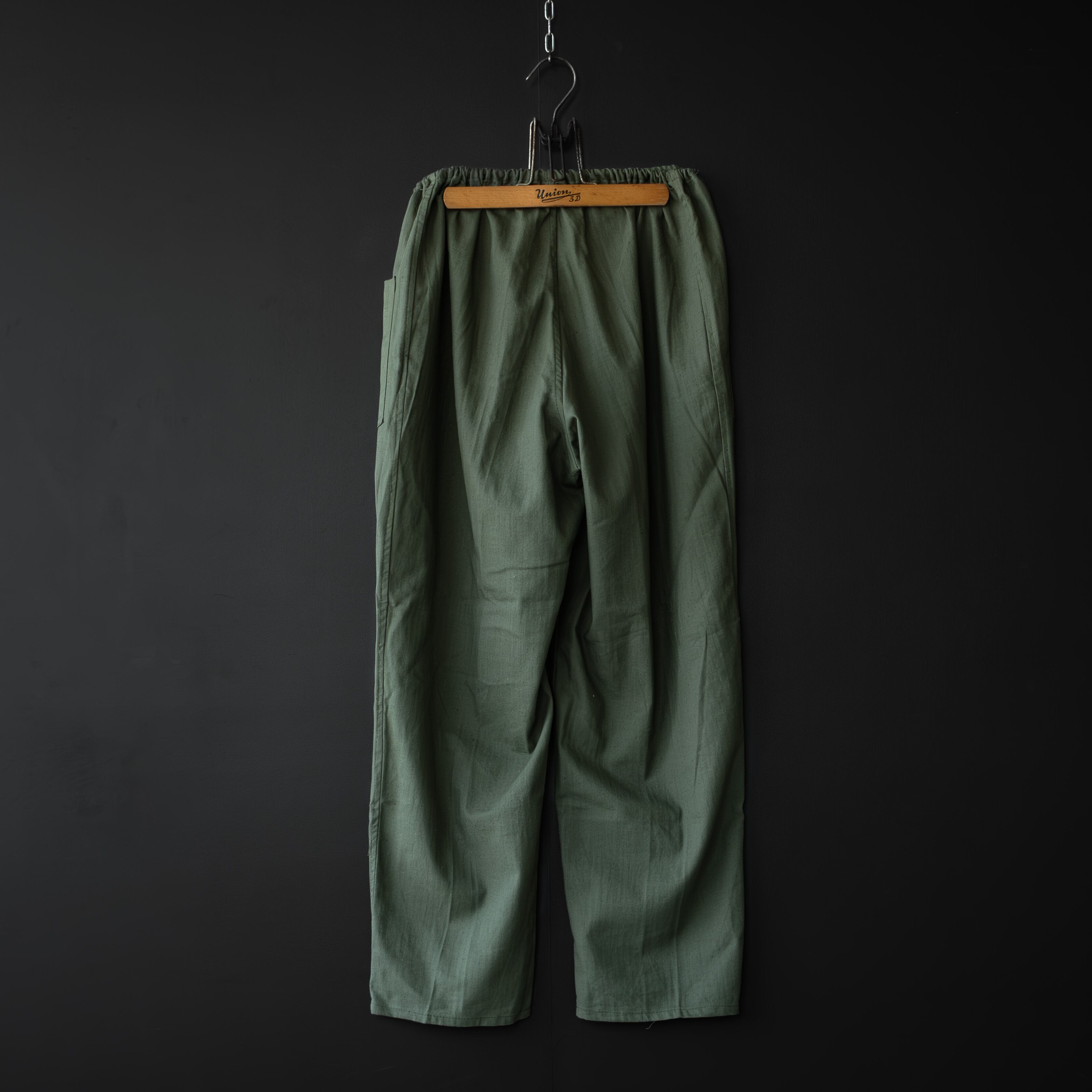 ウエスト部分にコードを加えて調整可能にし、フロントの左右にポケットを後付けして普段履きも可能な仕様にリメイク。