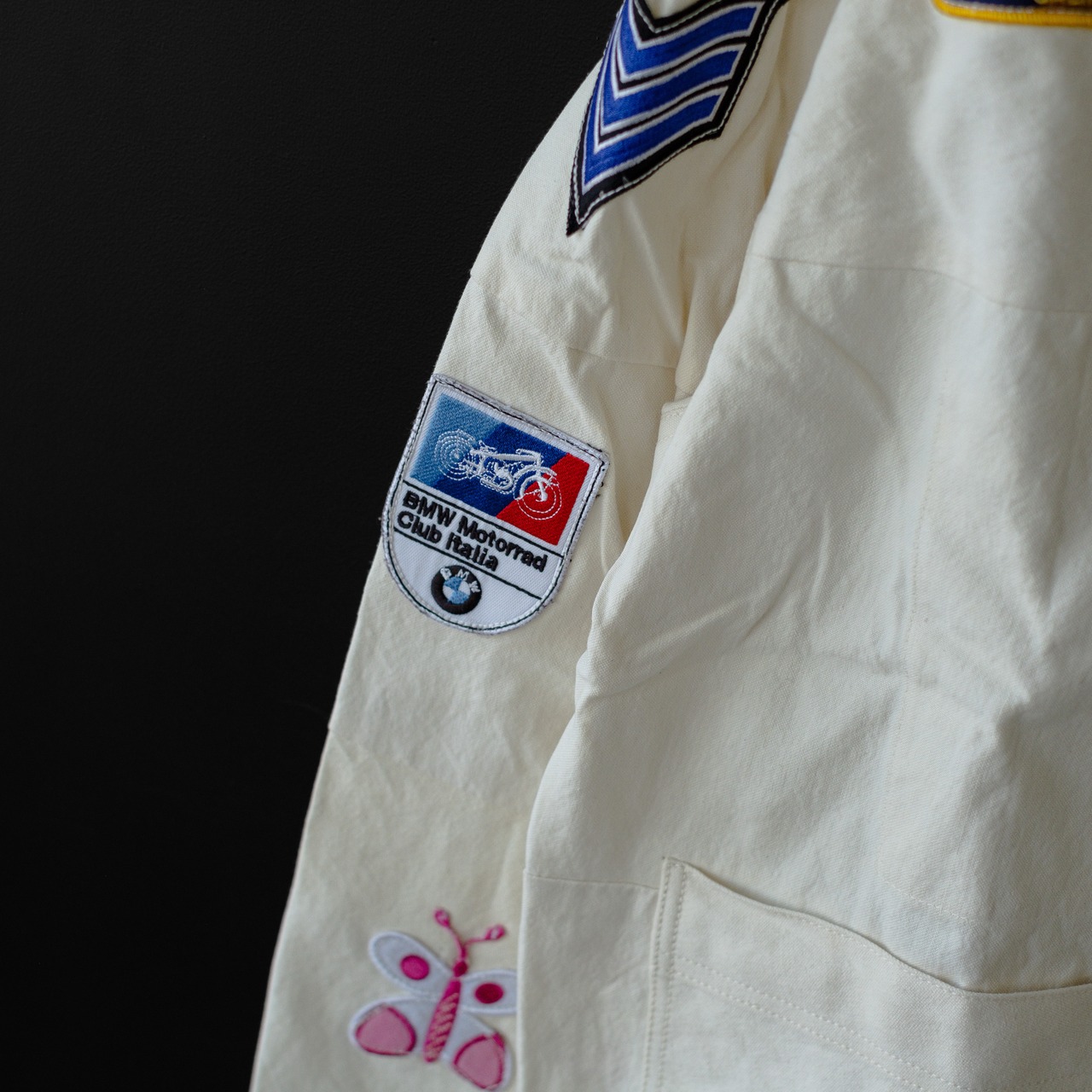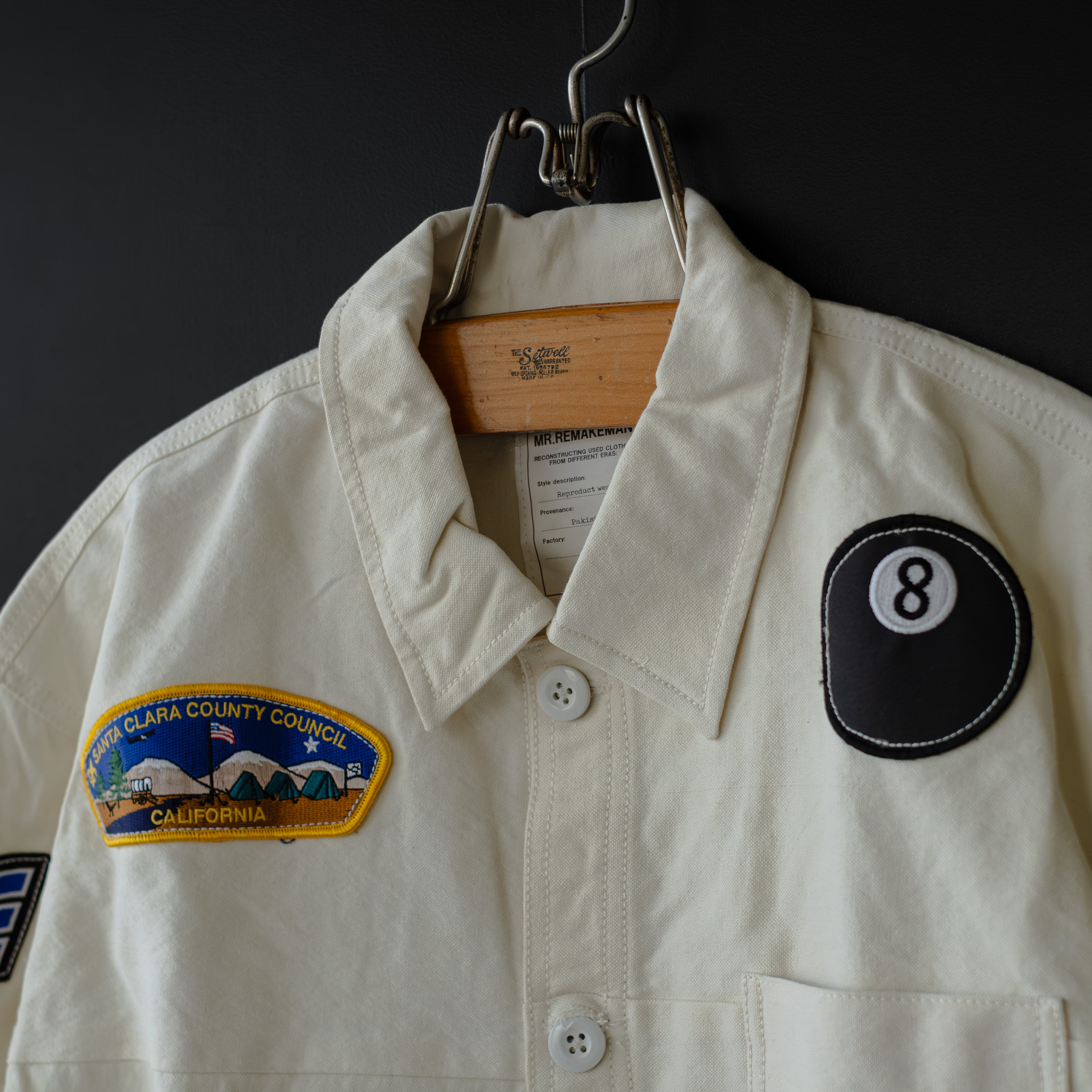 ダックのような厚手の生地のパッチワークでシャツを構築し、古着のワッペンを散りばめたシャツジャケット。