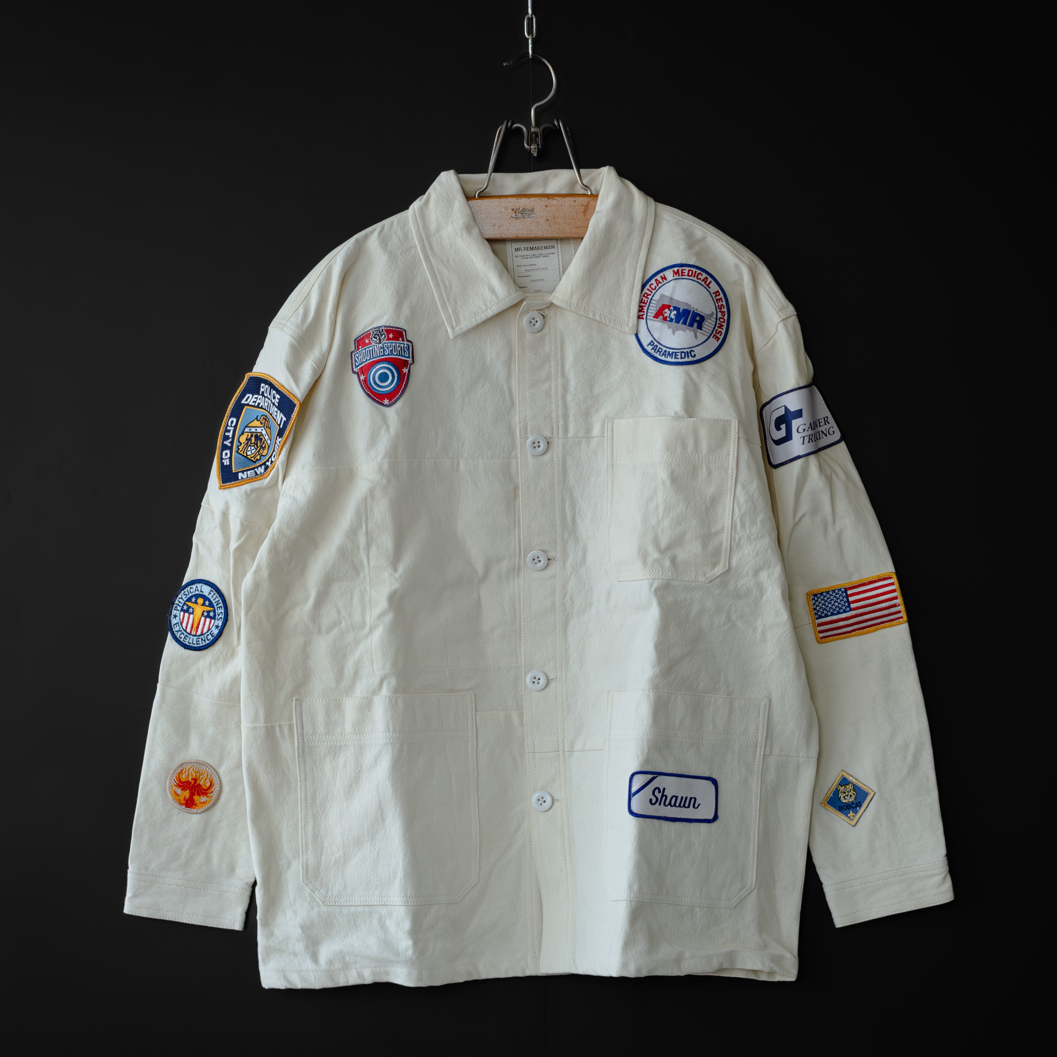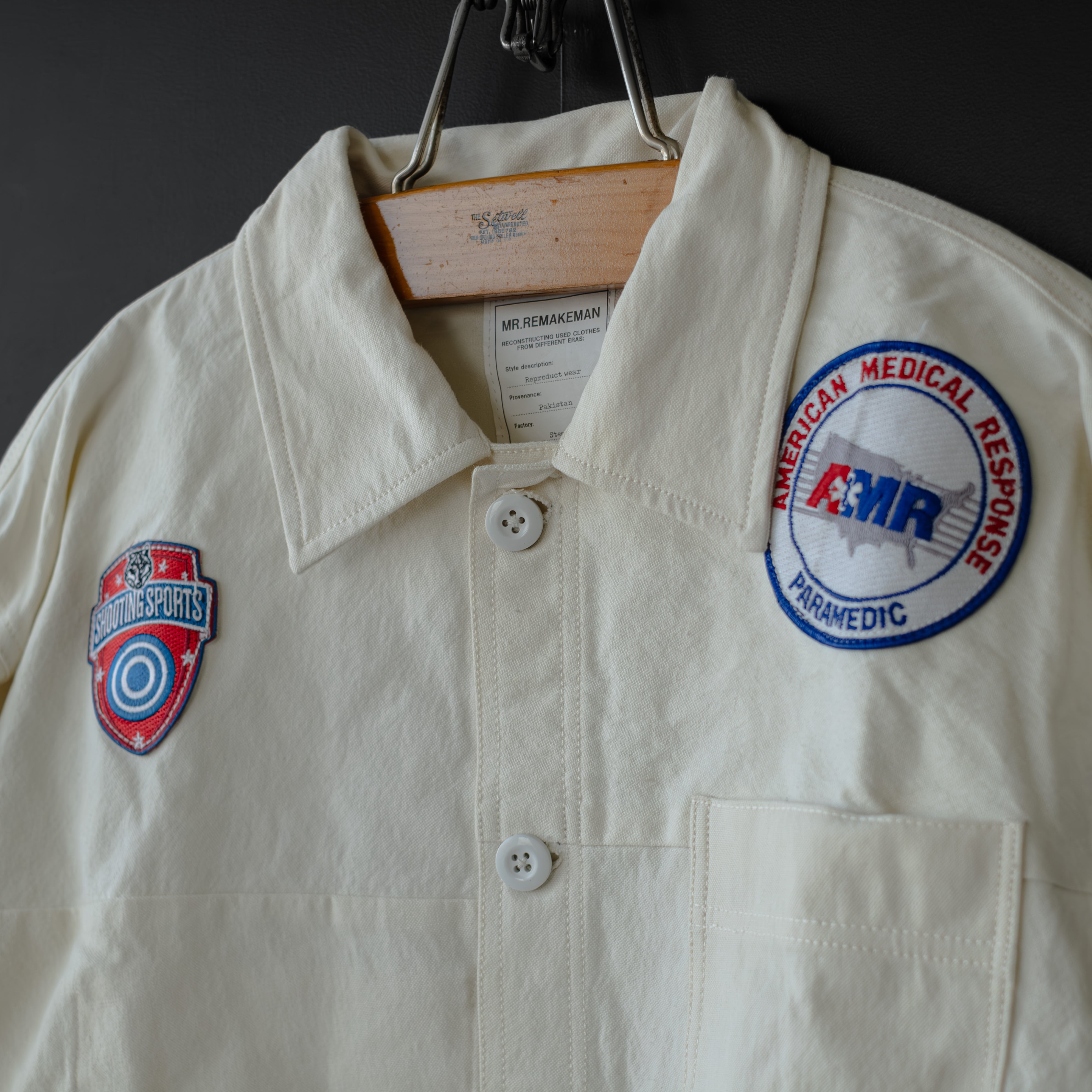 ダックのような厚手の生地のパッチワークでシャツを構築し、古着のワッペンを散りばめたシャツジャケット。
