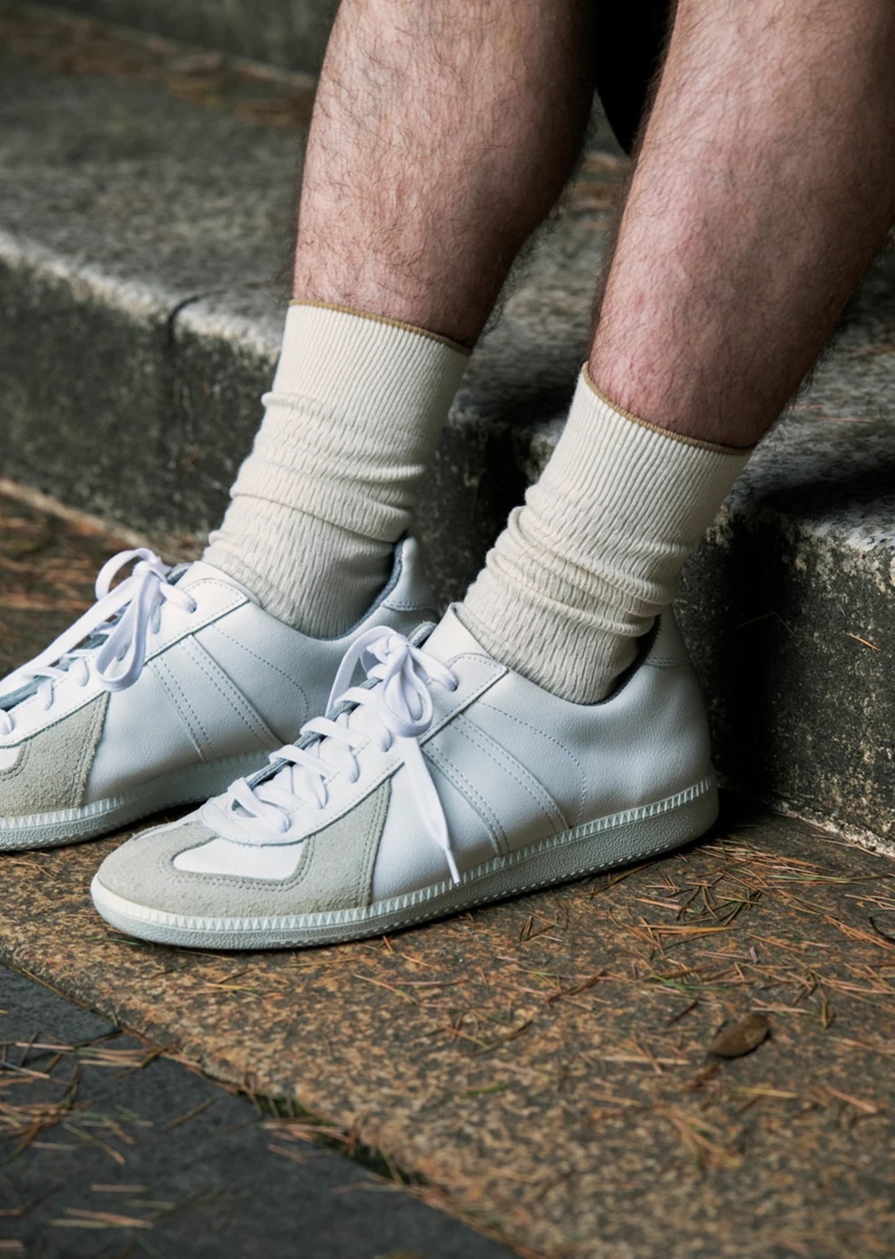 着用時に立体的な編み目が浮かび上がるよう設計されており、スニーカーにも革靴にも合わせやすい、程よい肉感に。