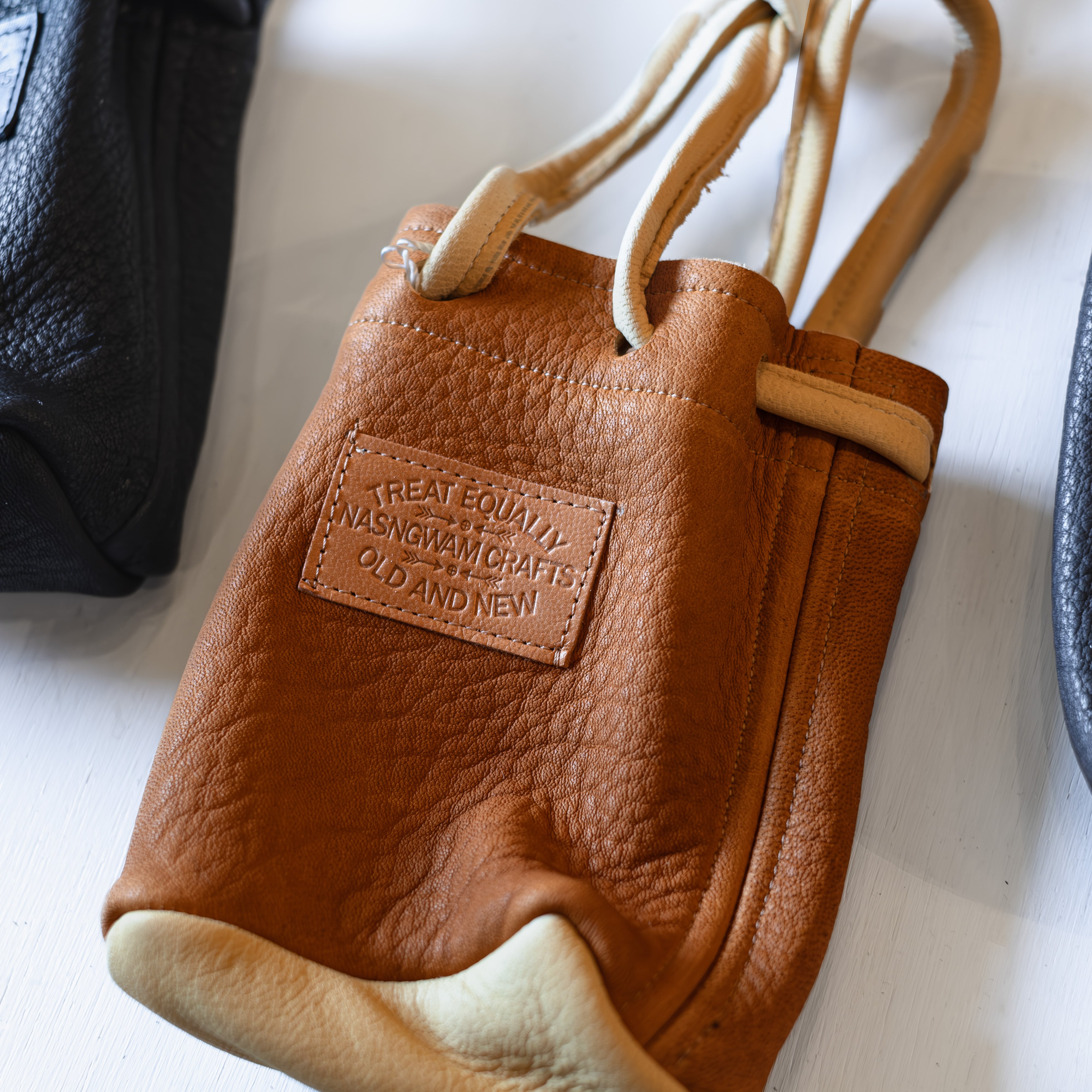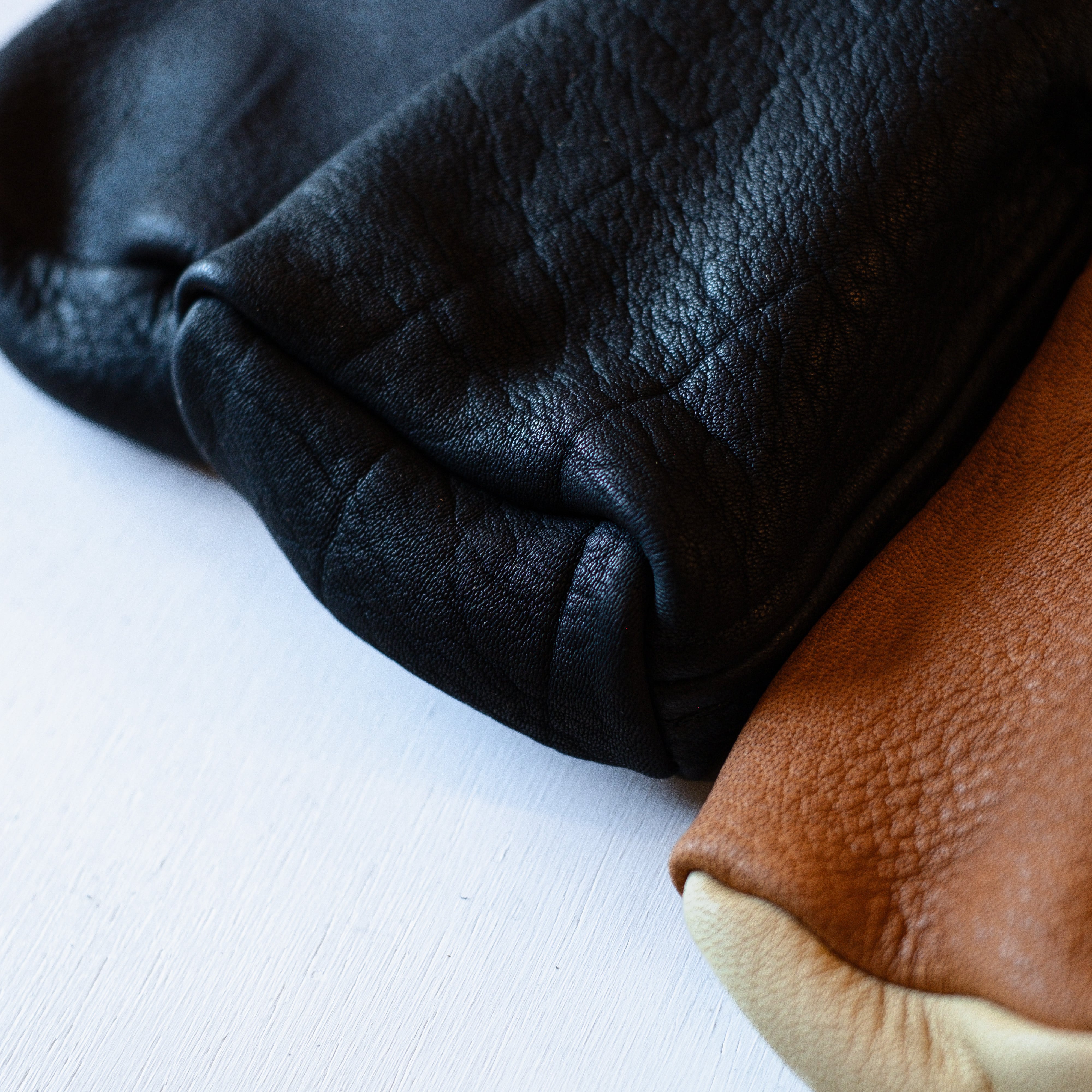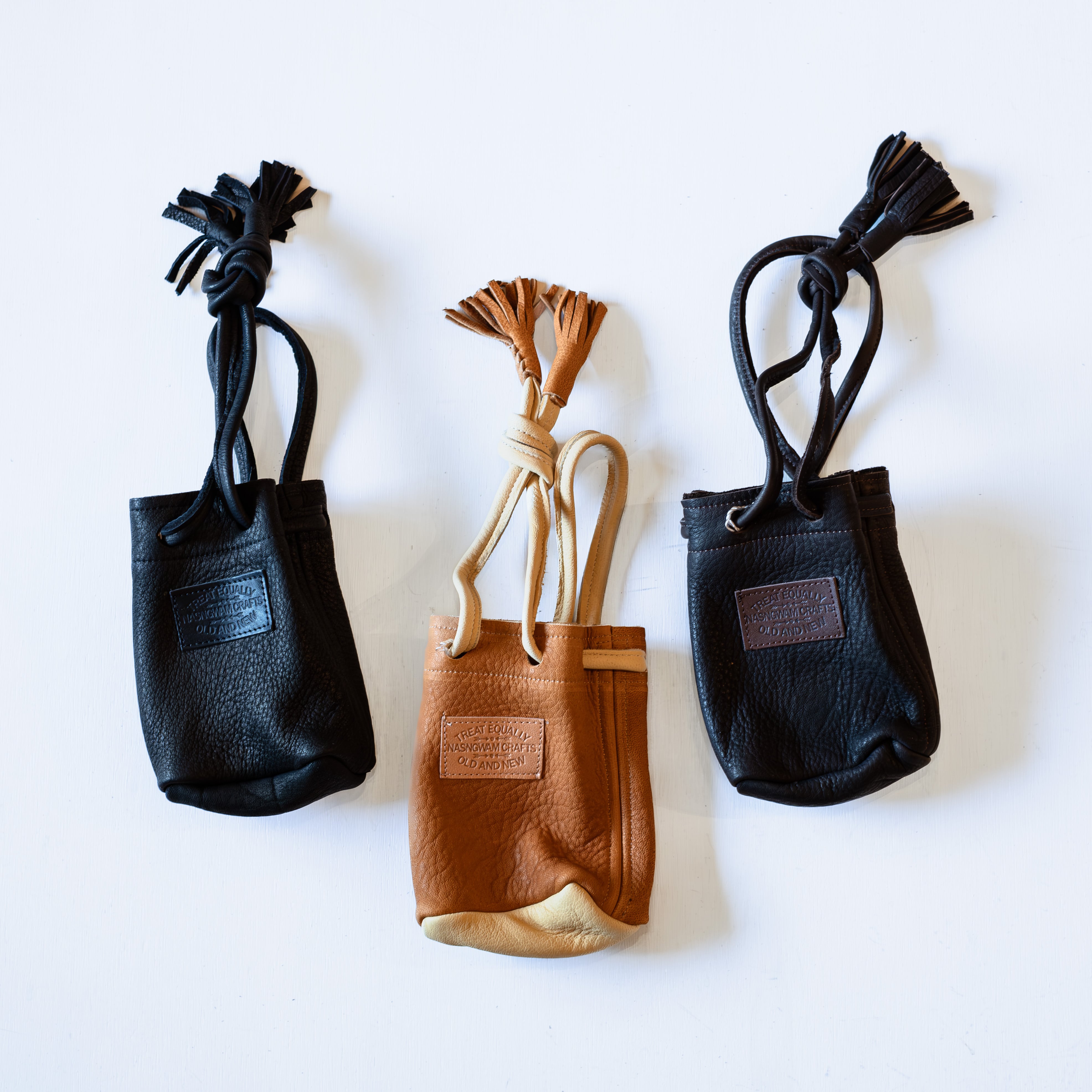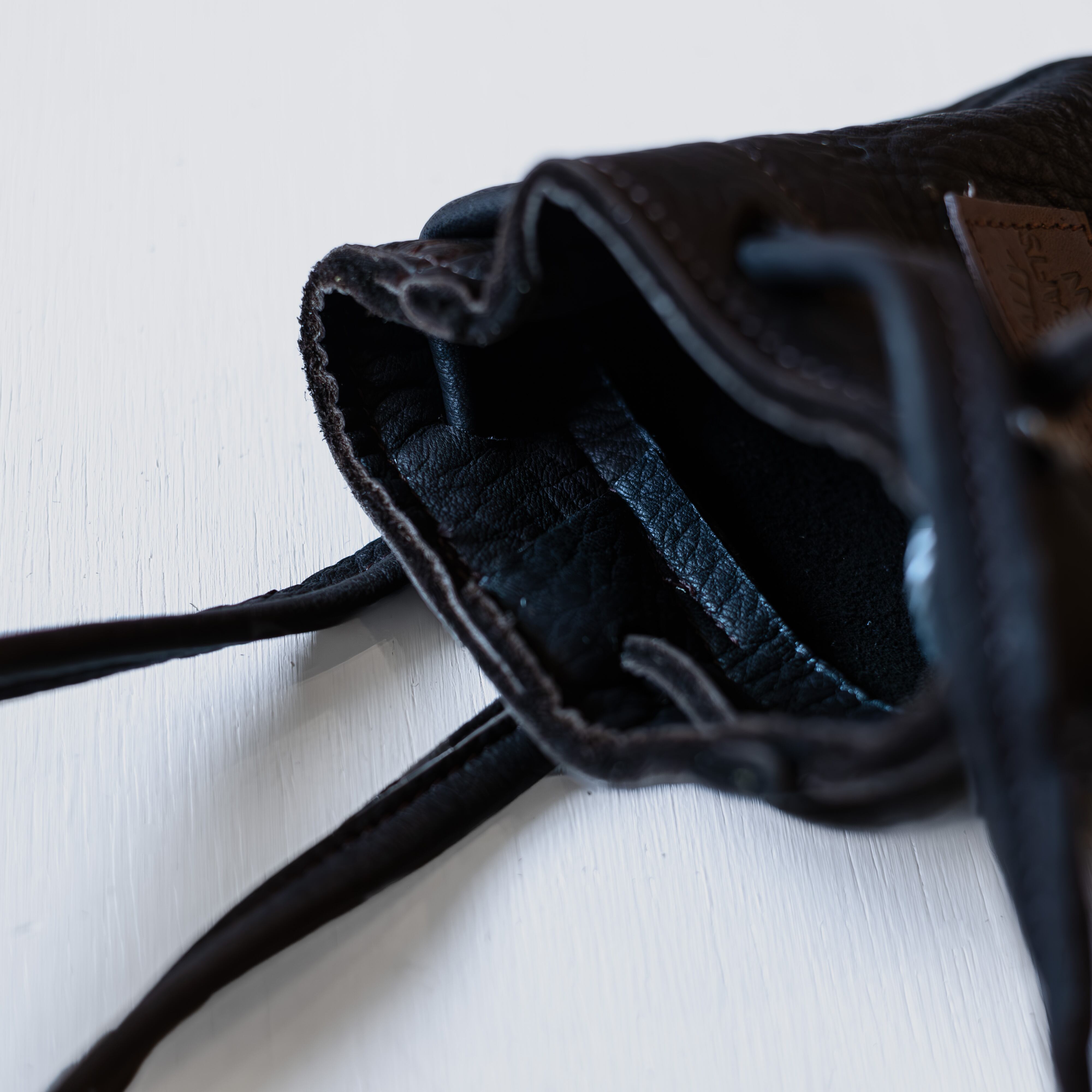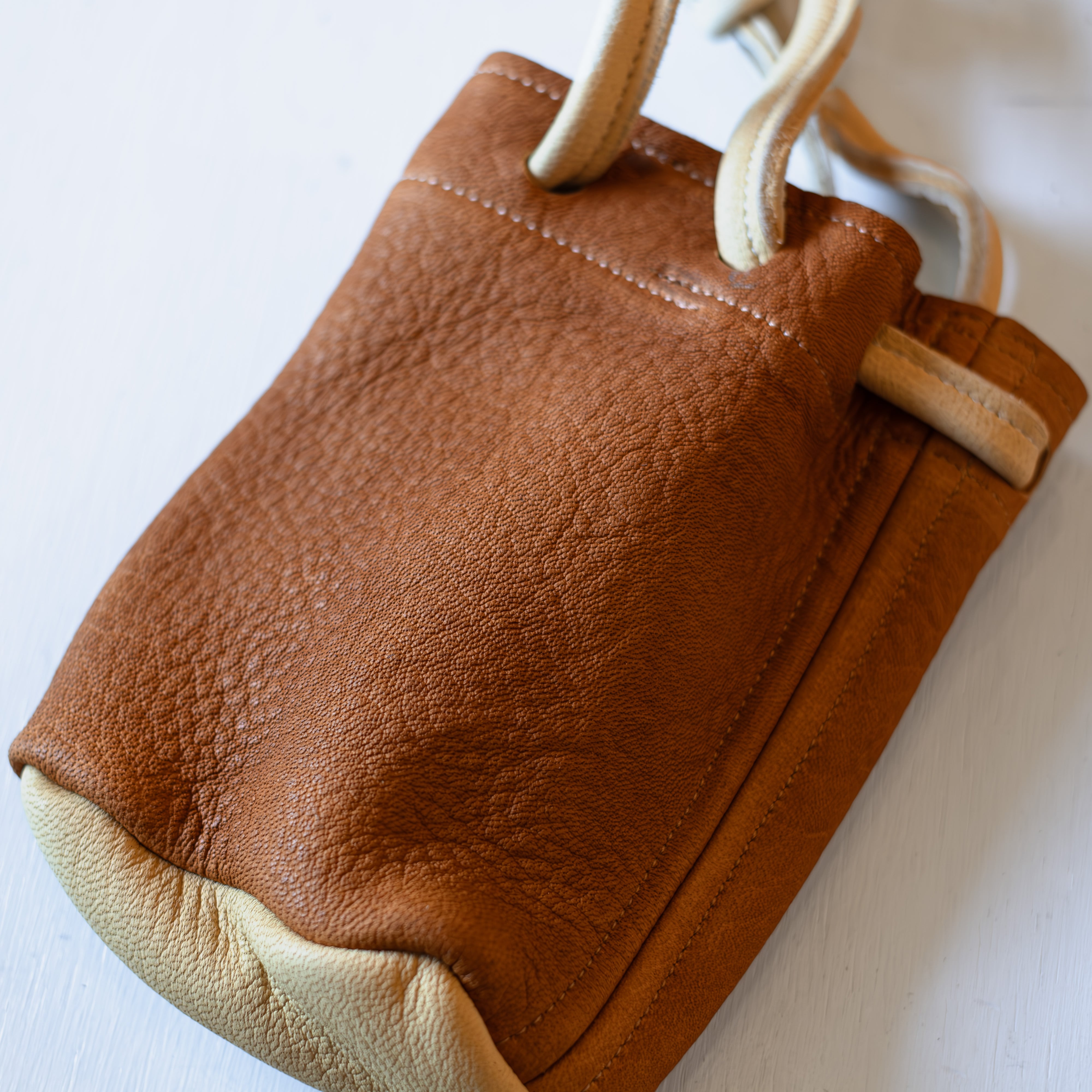 柔らかく扱いやすいディアスキンで作られた巾着的なバッグ。