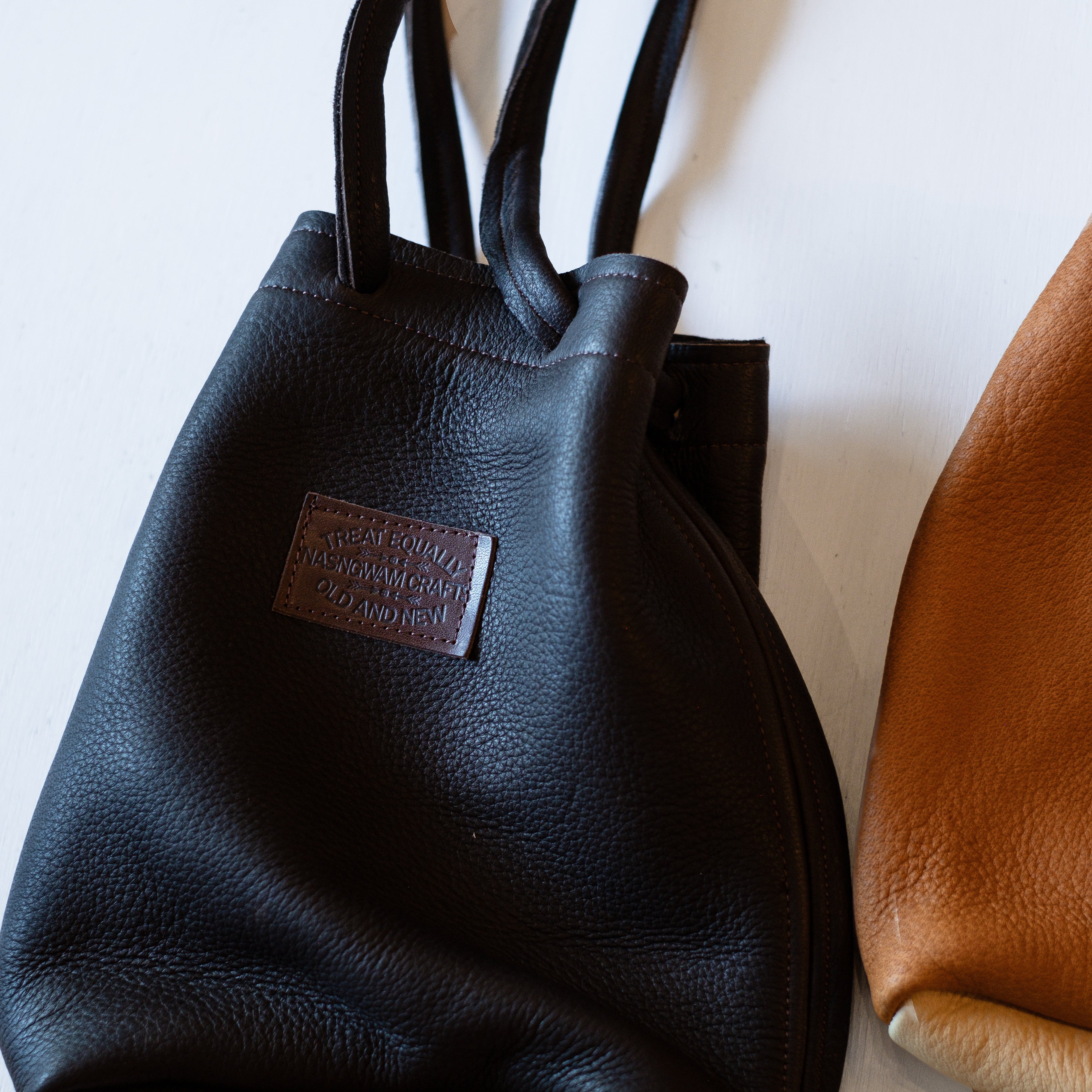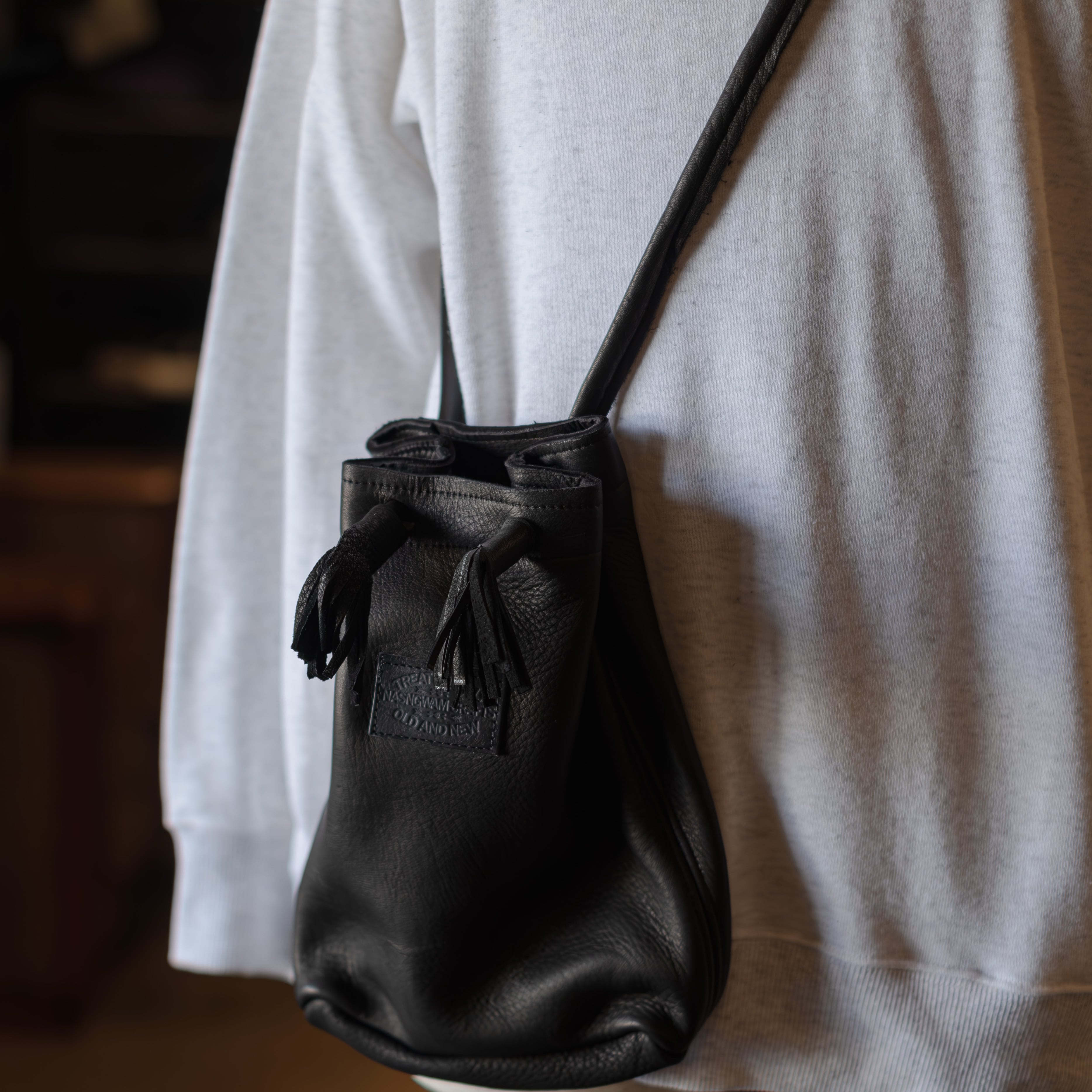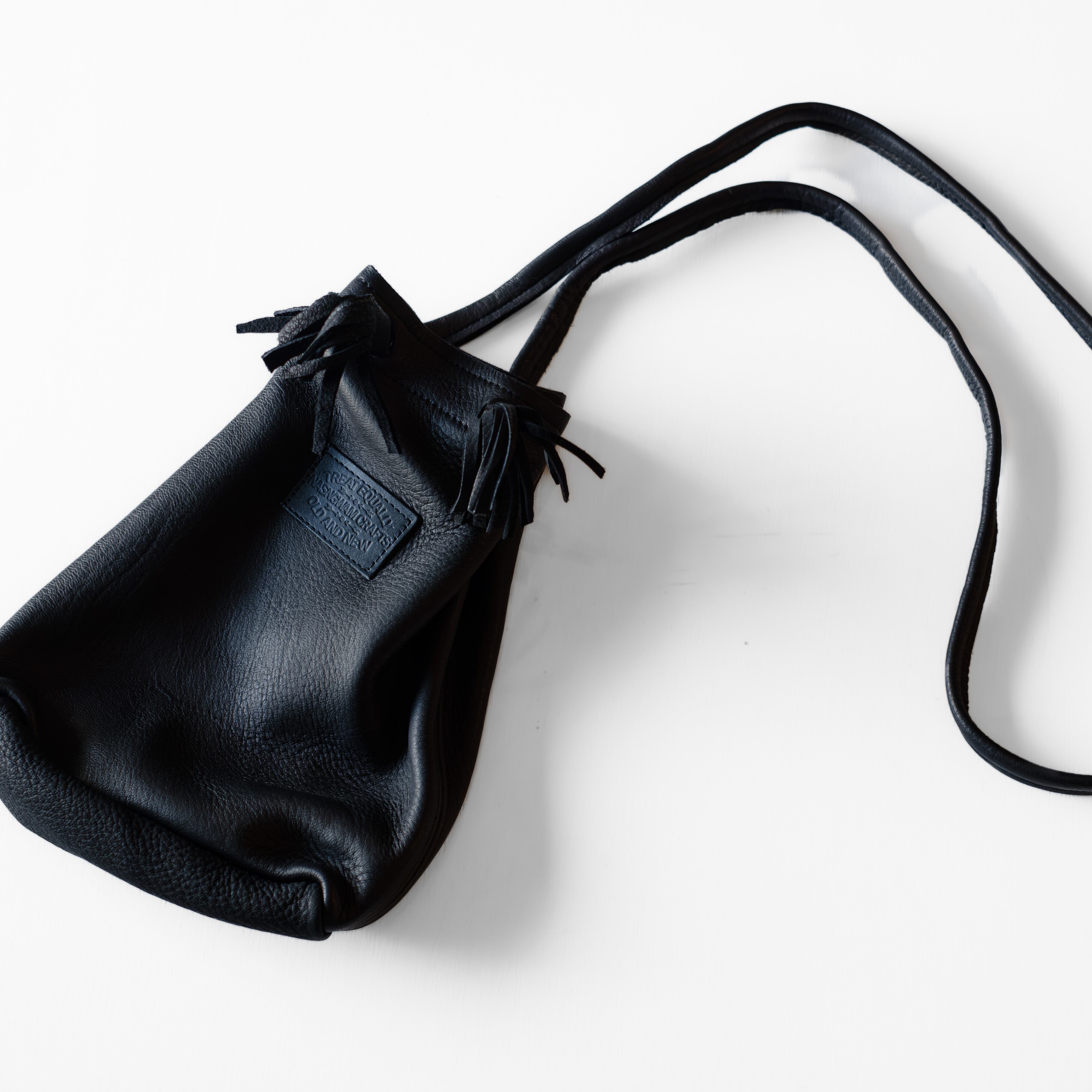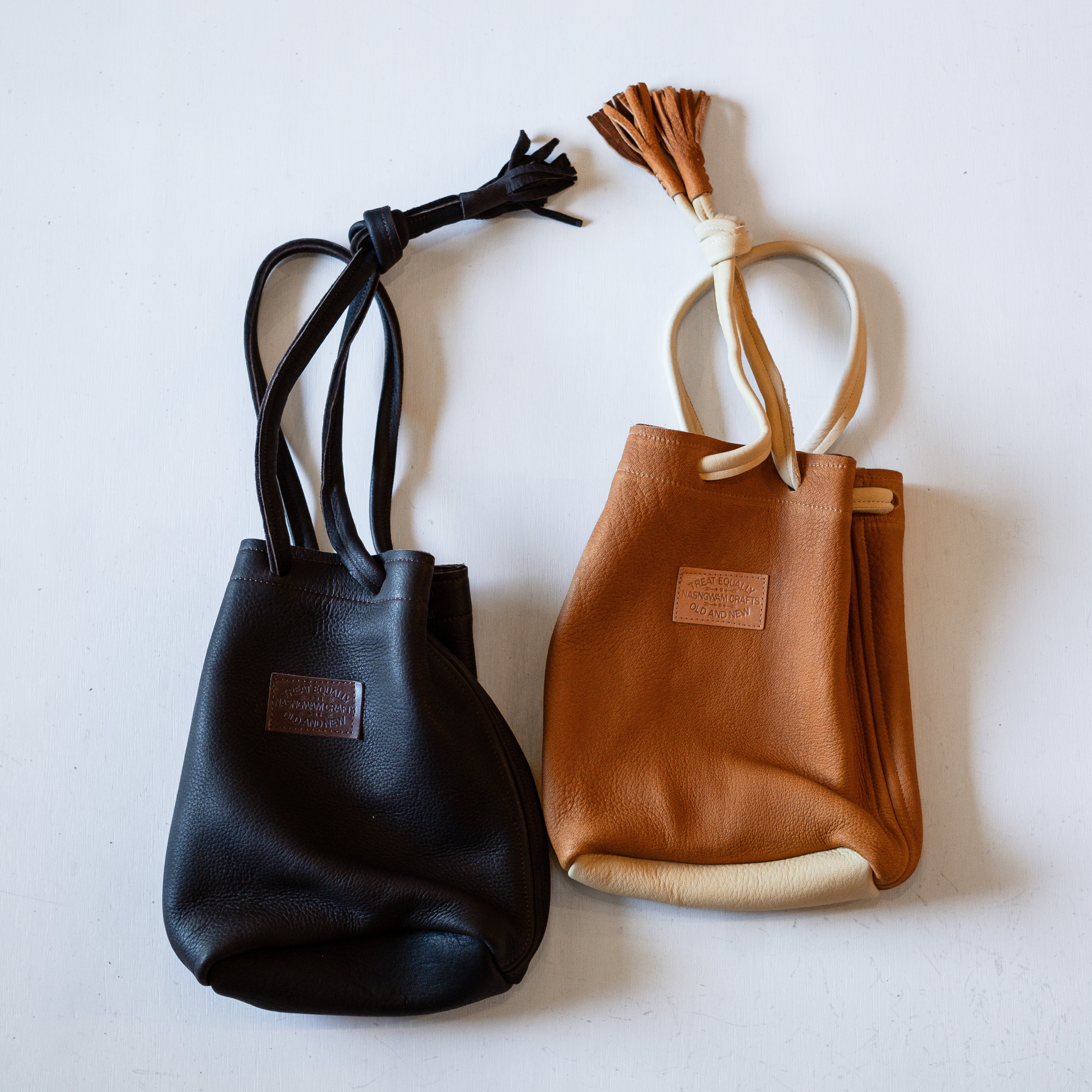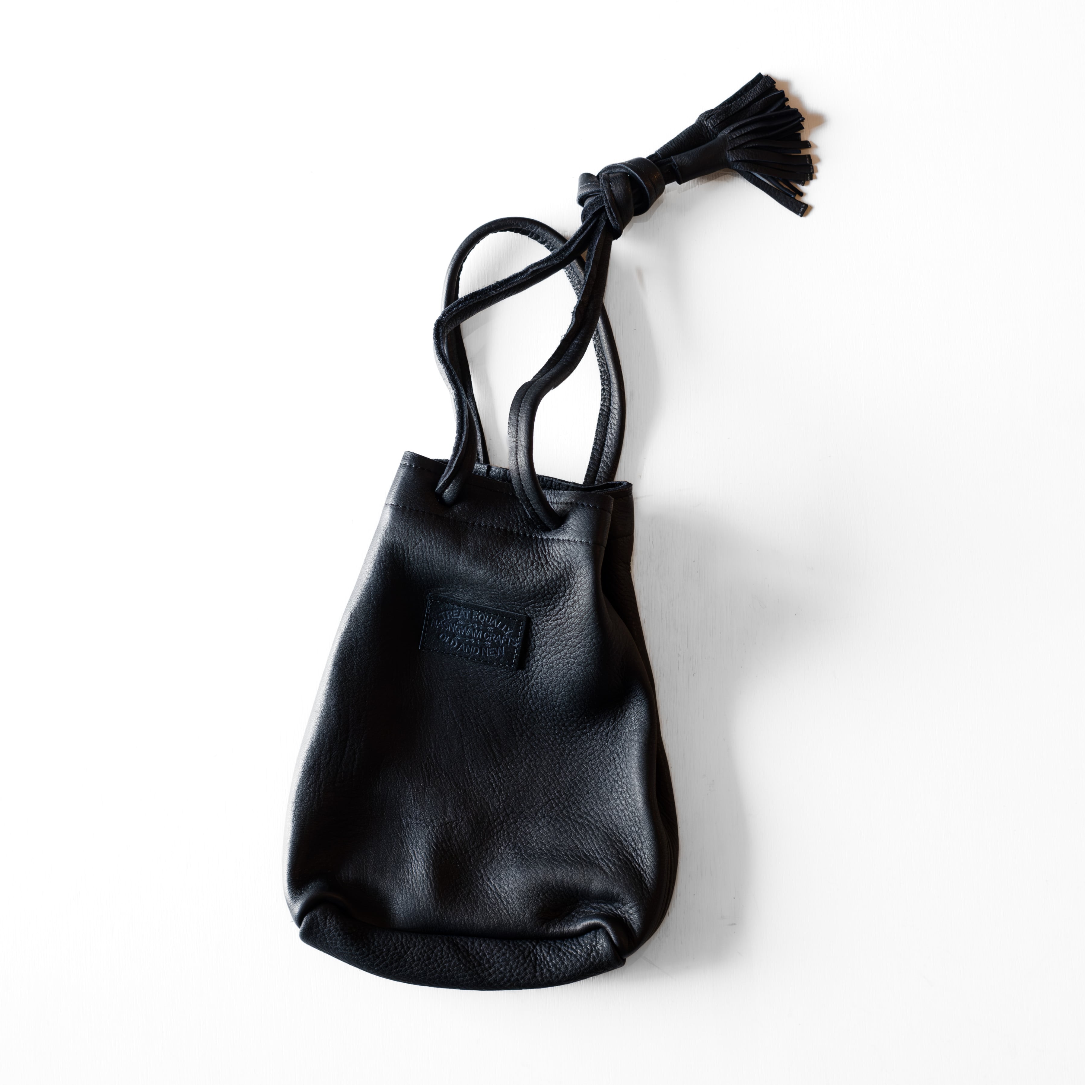柔らかく扱いやすいディアスキンで作られた巾着的なバッグ。