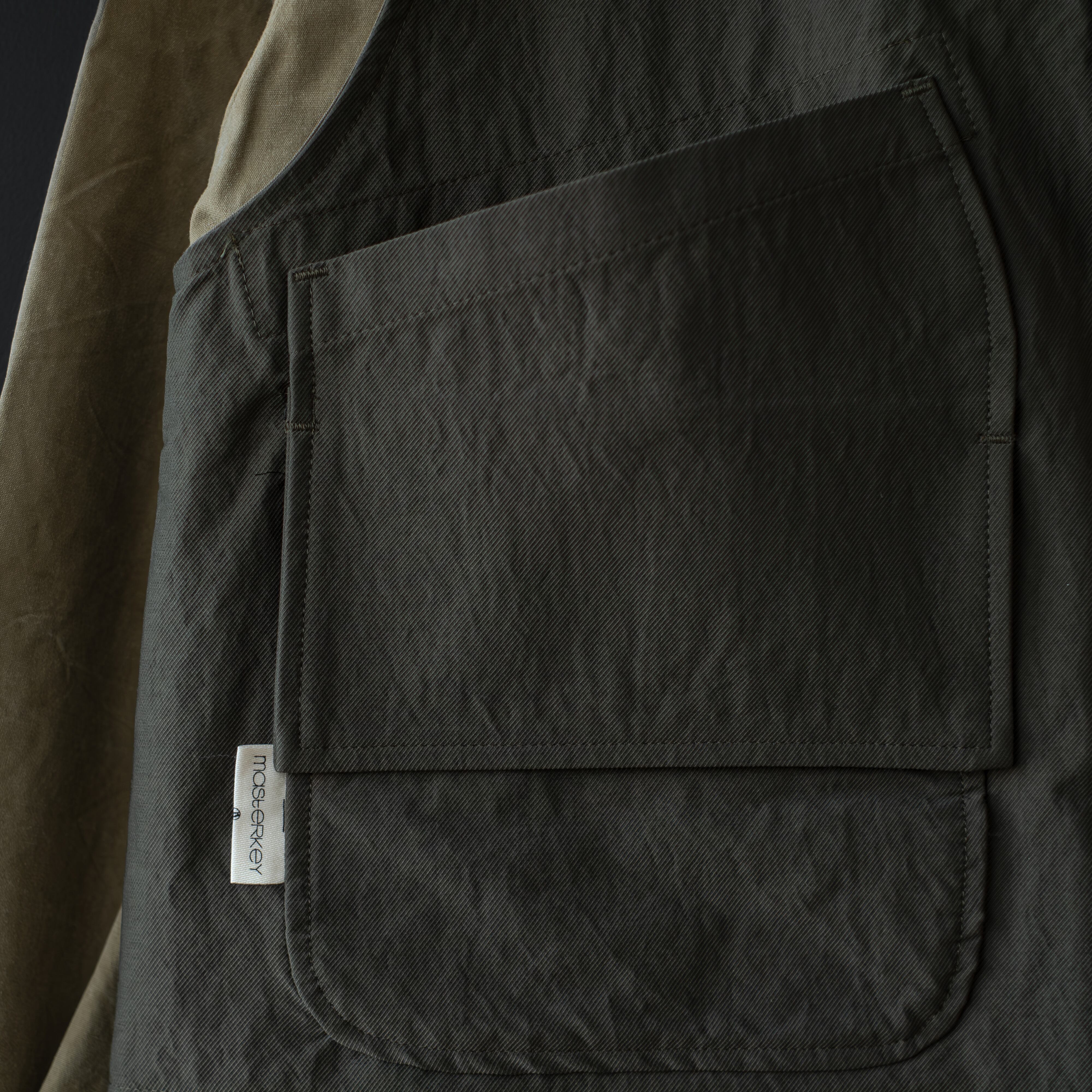 ストレッチの効いたペーパーライクなミリタリー調な素材をミックスして製作したアイテム。