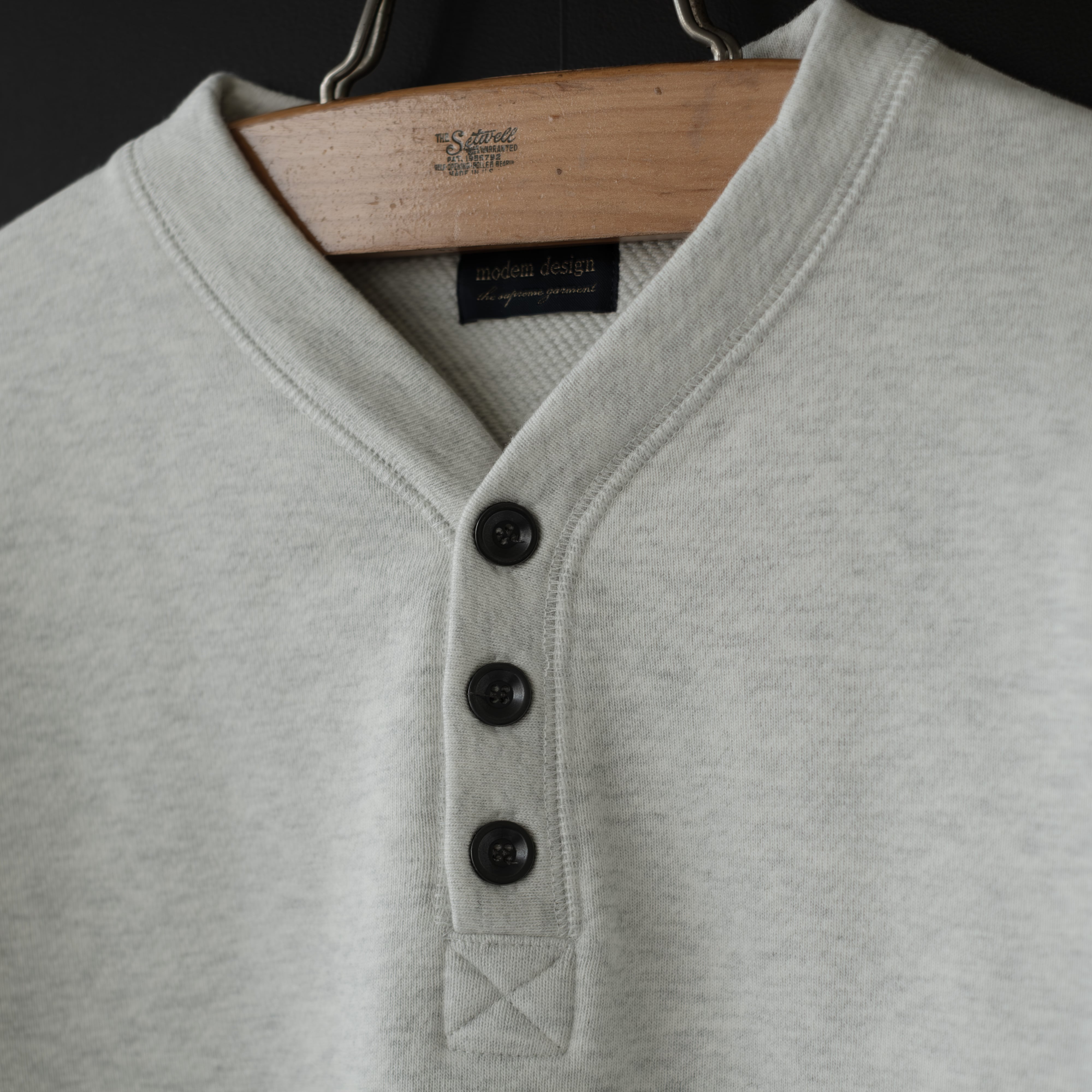 普通のクルーネックではなくヘンリーネックにすることによりやや大人な印象。