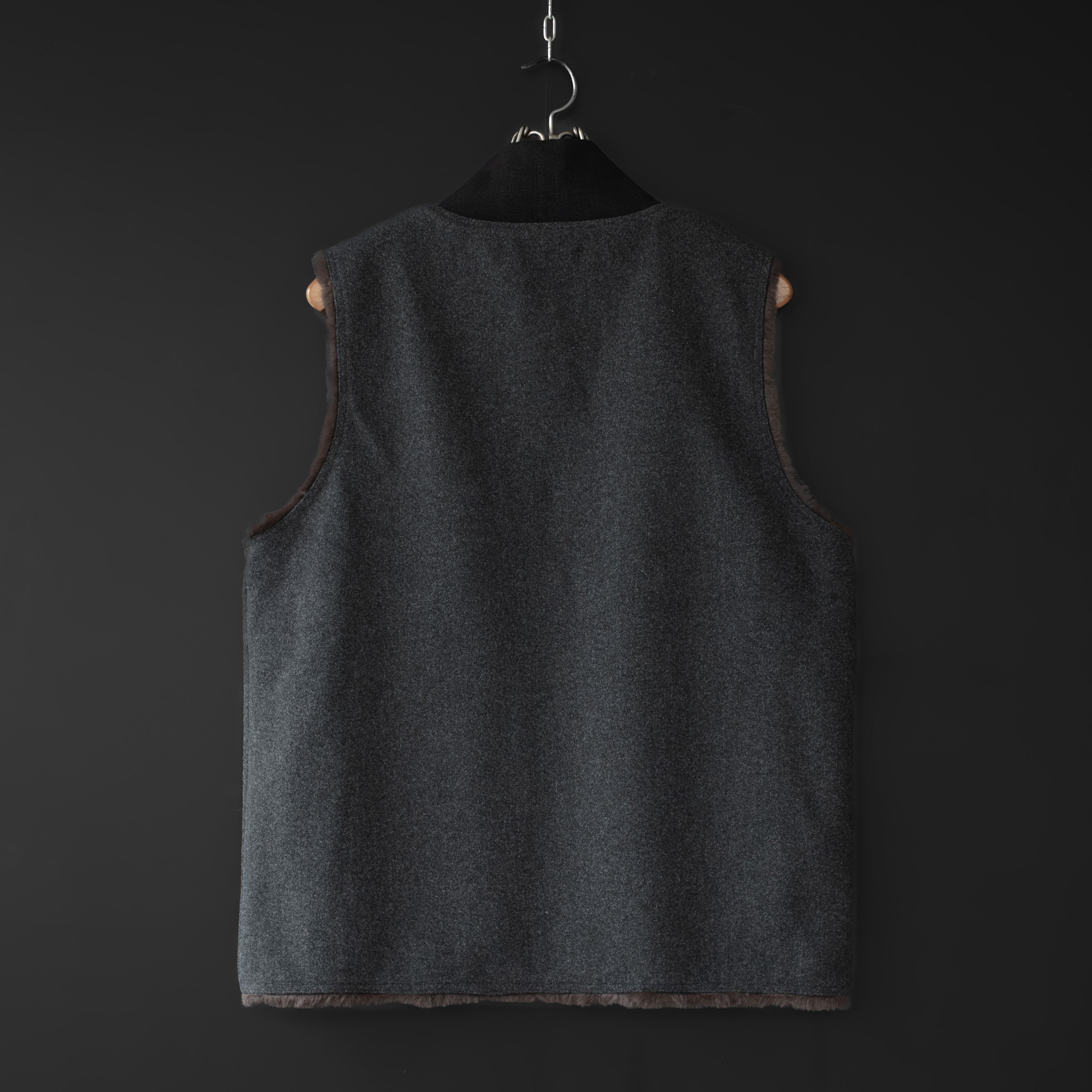 アウターの上にも羽織れそうですし、リバーシブル仕様で裏は無地の起毛生地なので全く違う表情の二度お得なベスト。