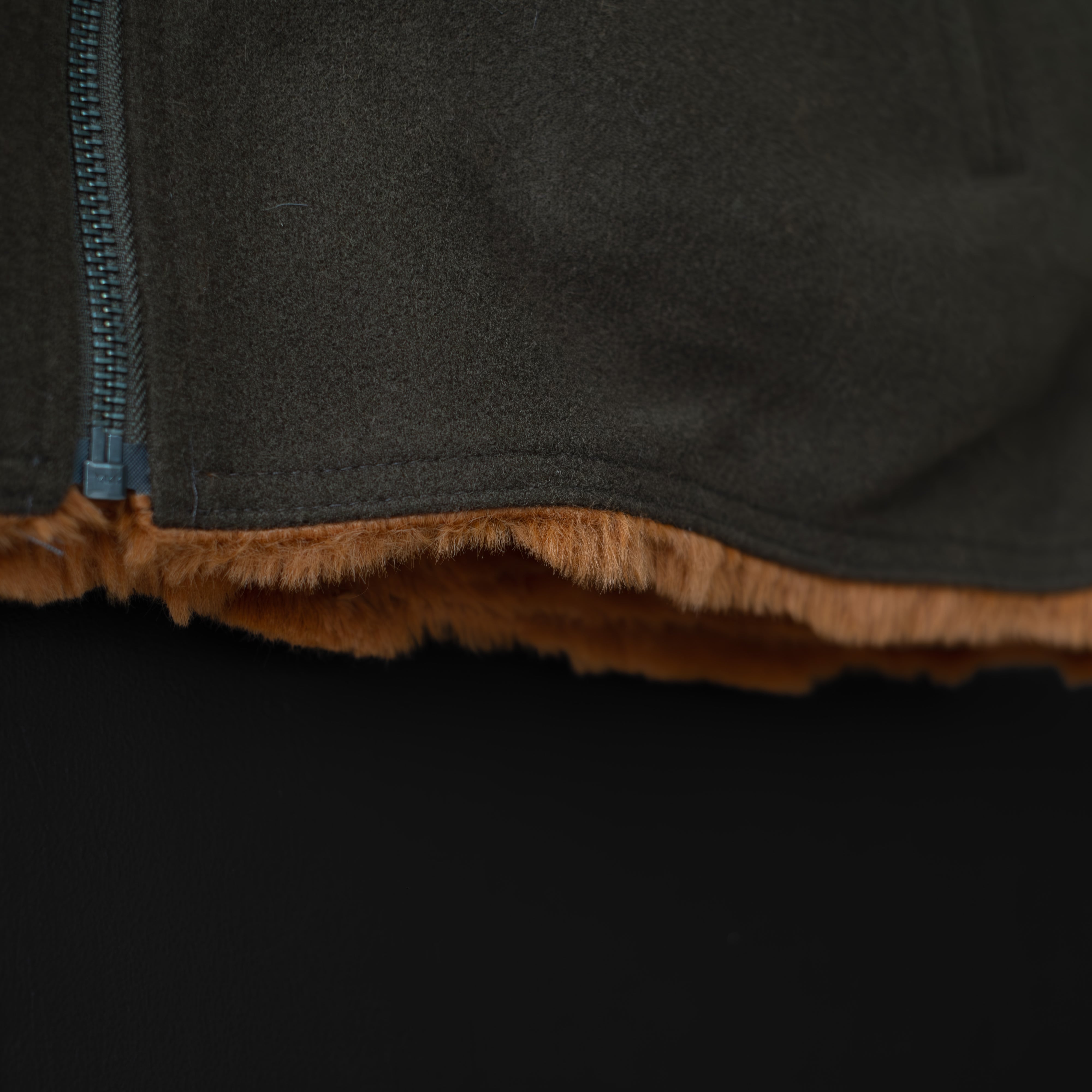 アウターの上にも羽織れそうですし、リバーシブル仕様で裏は無地の起毛生地なので全く違う表情の二度お得なベスト。