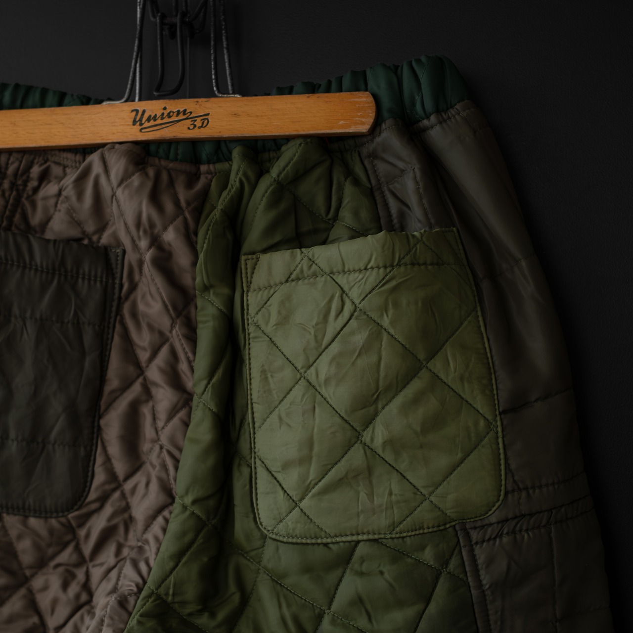 ミリタリーなどによく見られるライナージャケットやライナーパンツを解体して、イージーパンツに再構築。