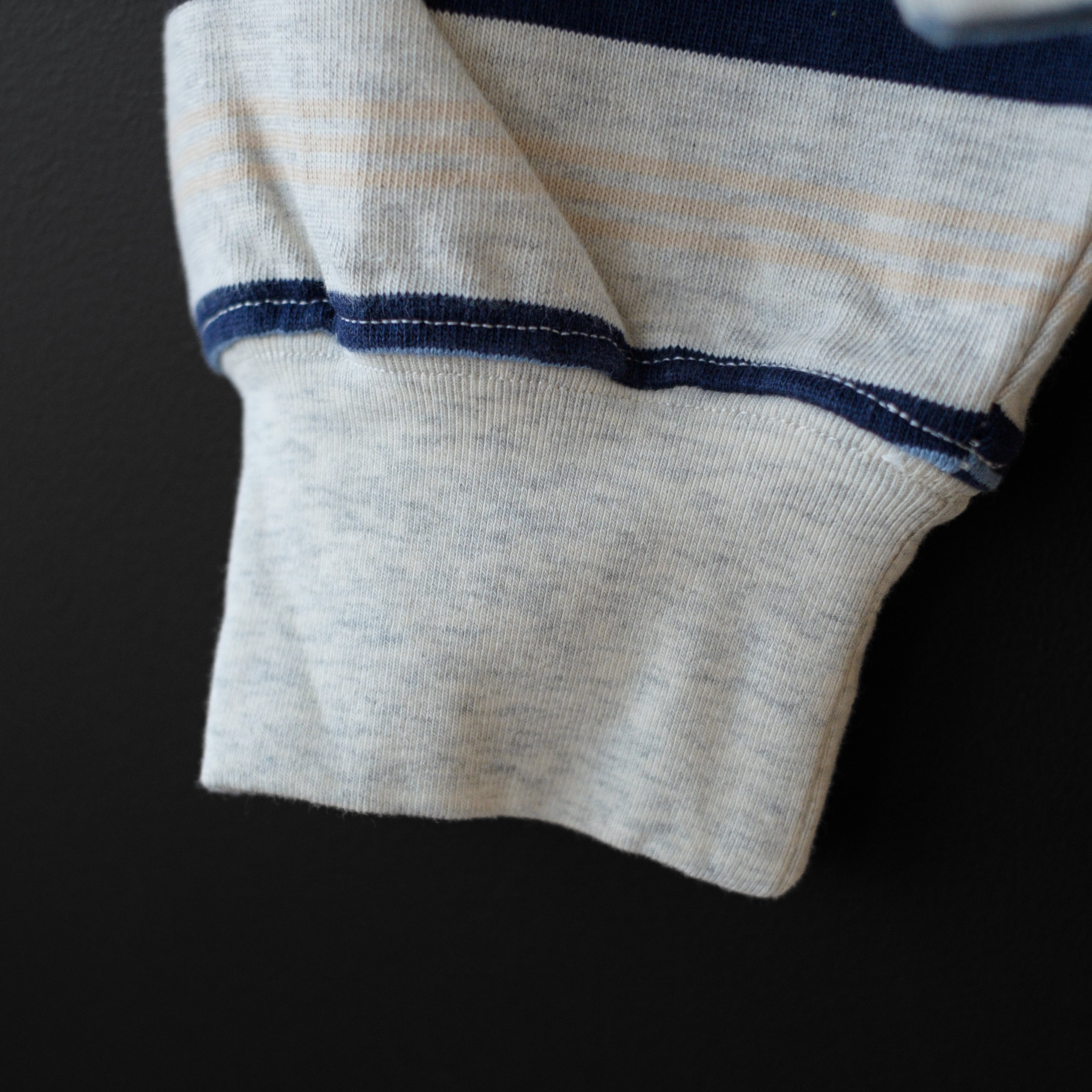 襟ぐりと袖先はリブではなくフライスを使用しているので肌あたりもよく、少し上品さも出ます。