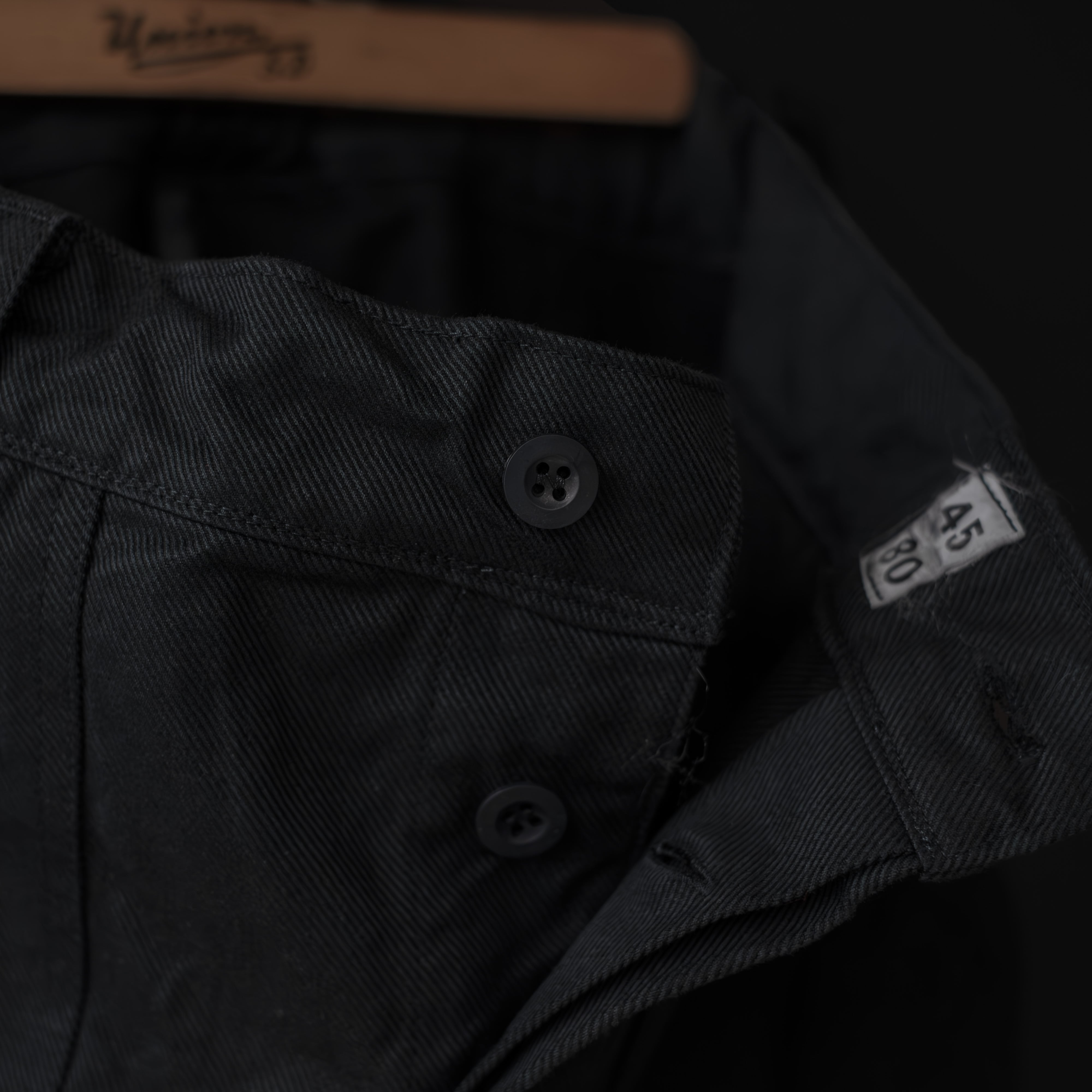 スイス軍が1980年代頃に採用していたデニムワークパンツを黒染め。