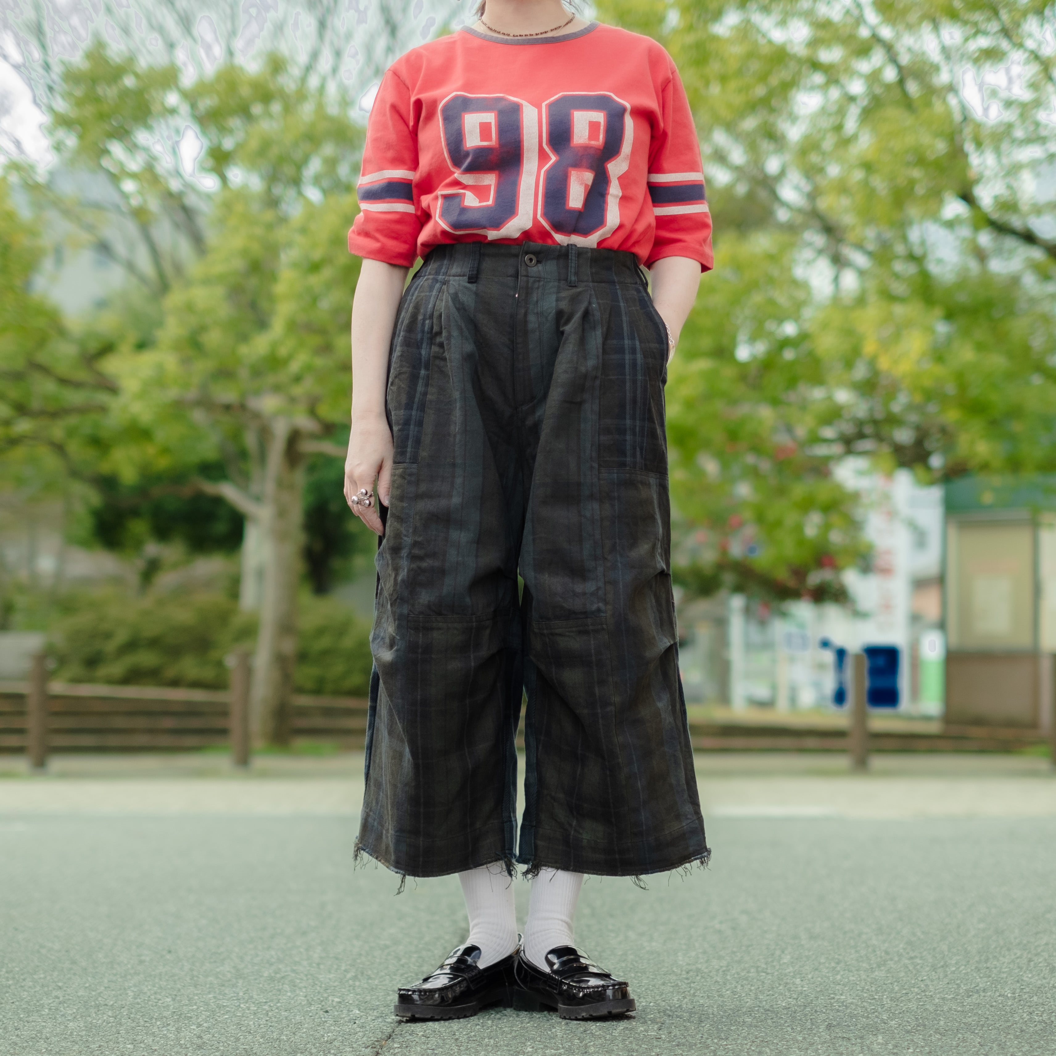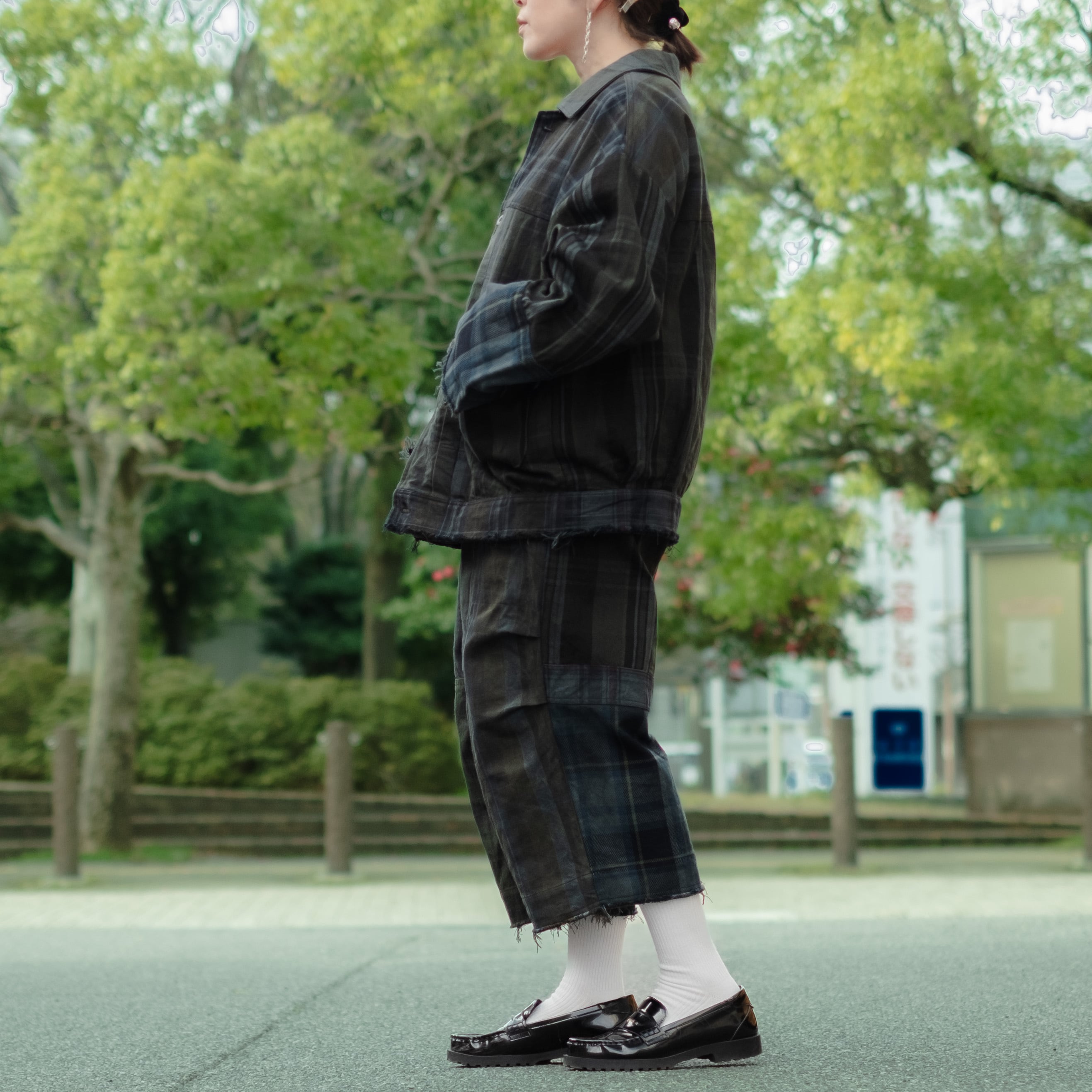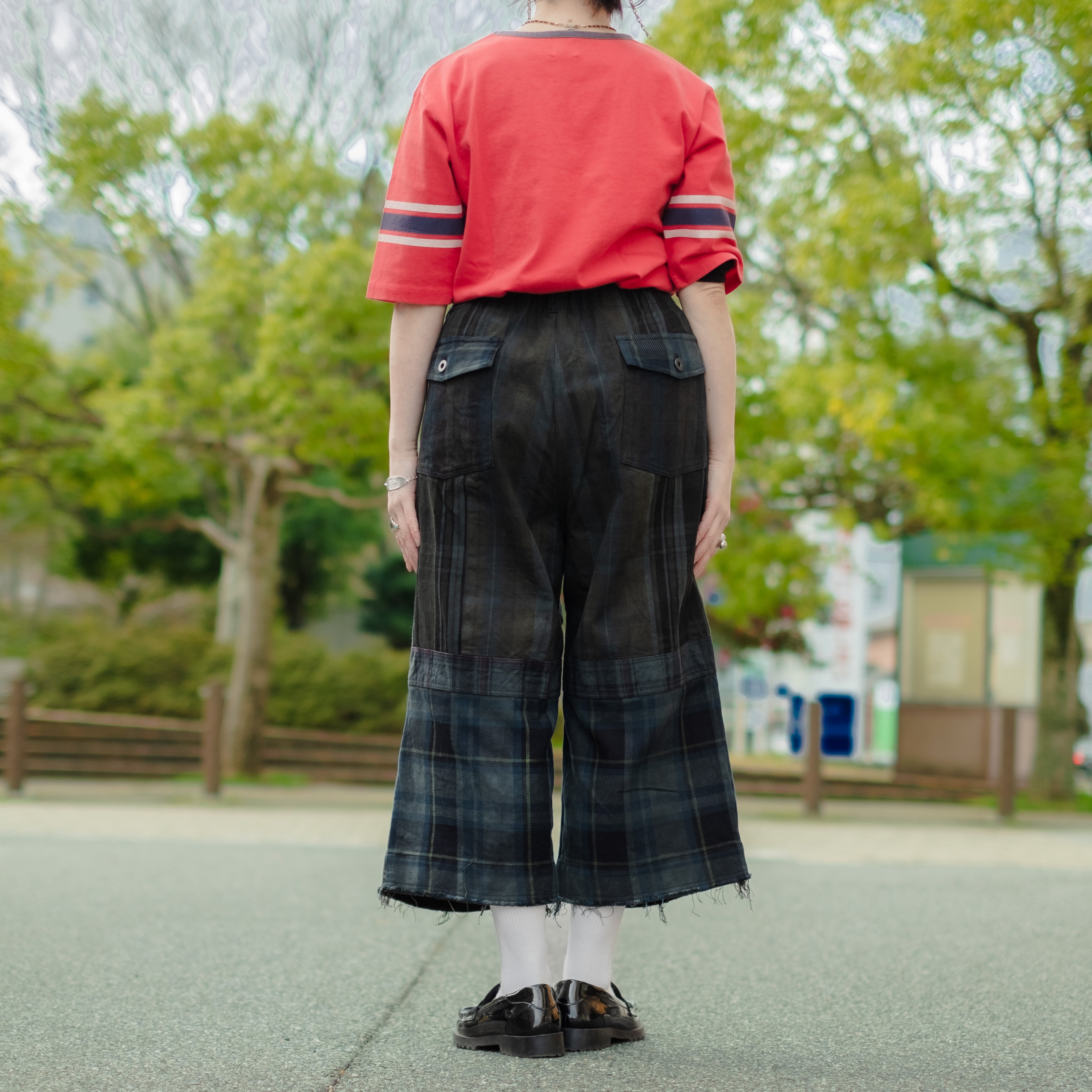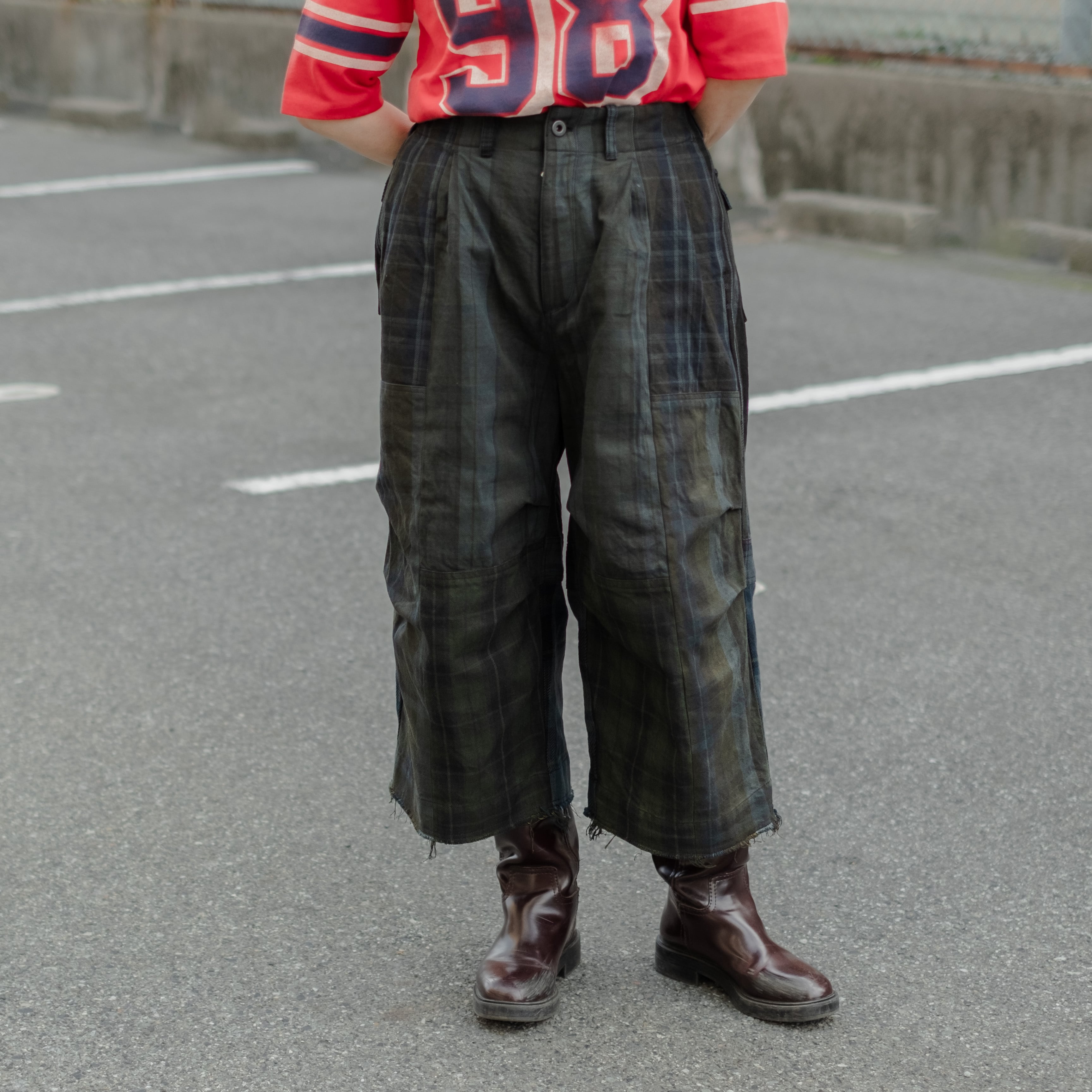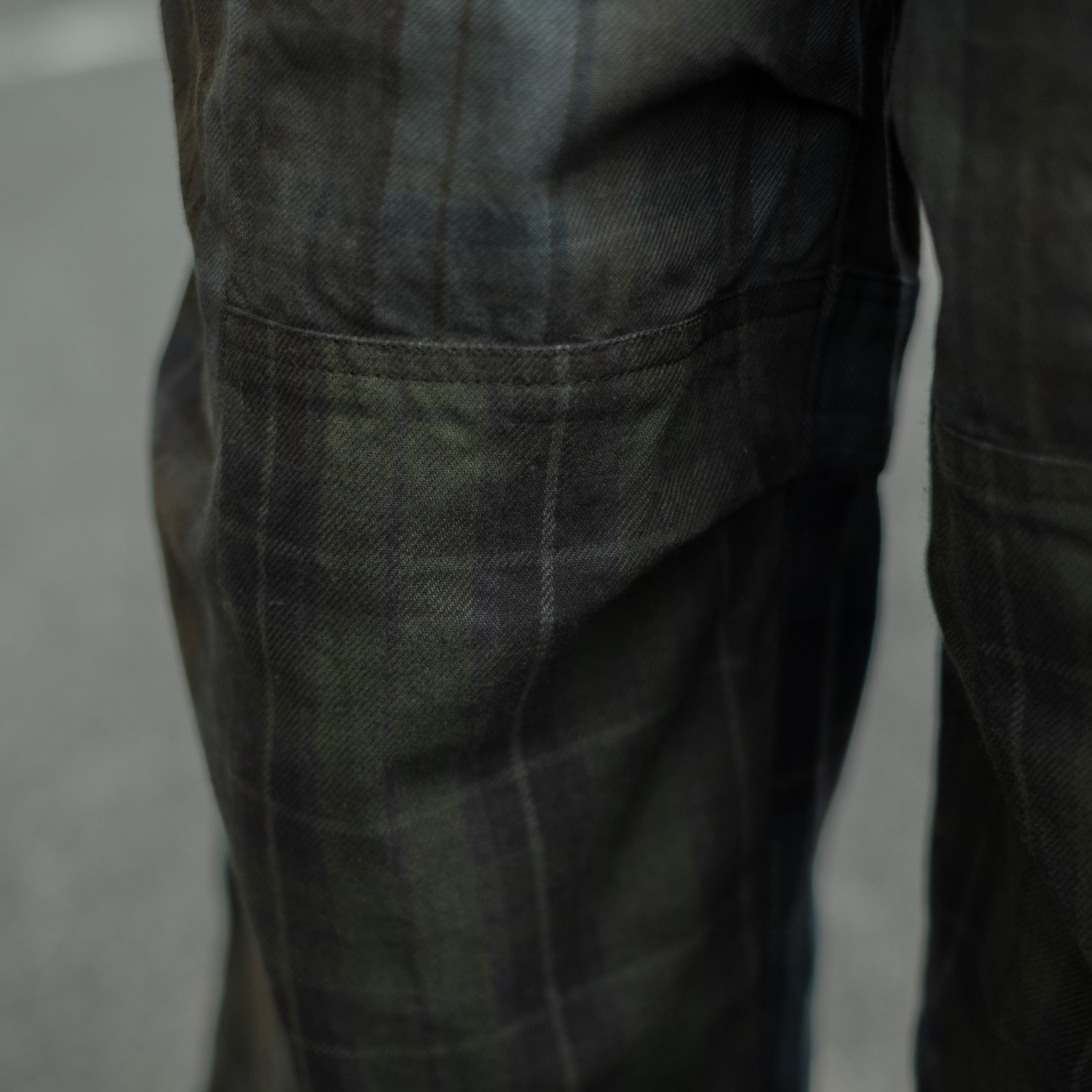 9種類の肉厚で近いチェック素材を用いて制作し、うっすらチェック柄が見えるように炭黒に製品染めをして統一感を出したハンパ丈のワイドパンツ。