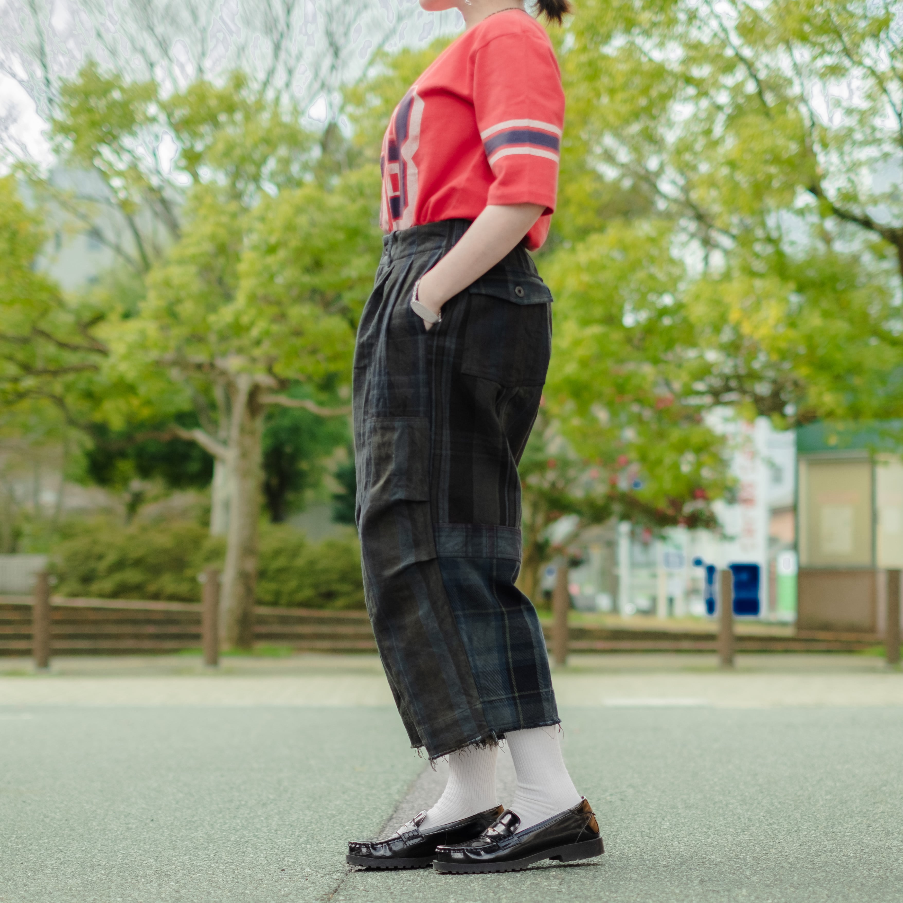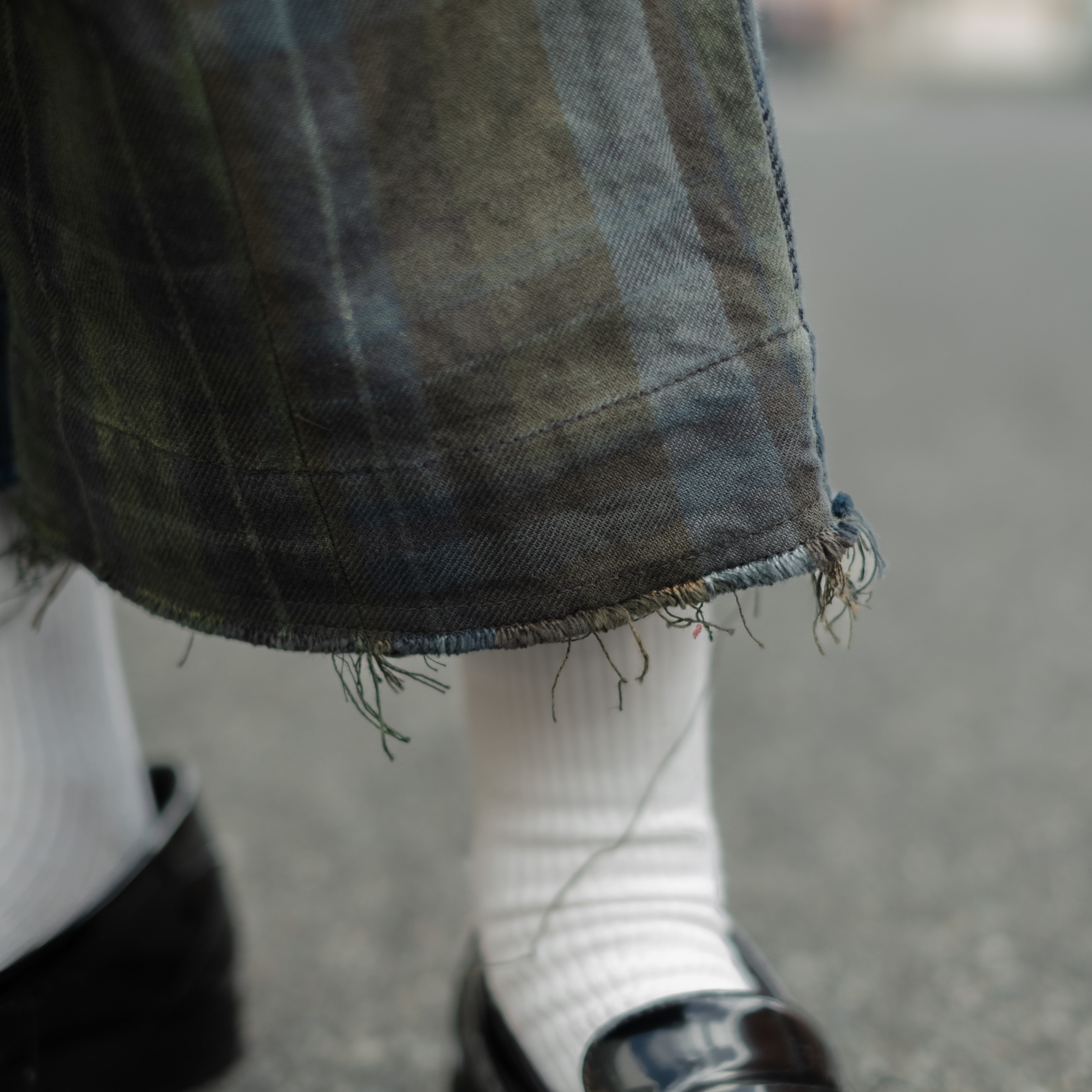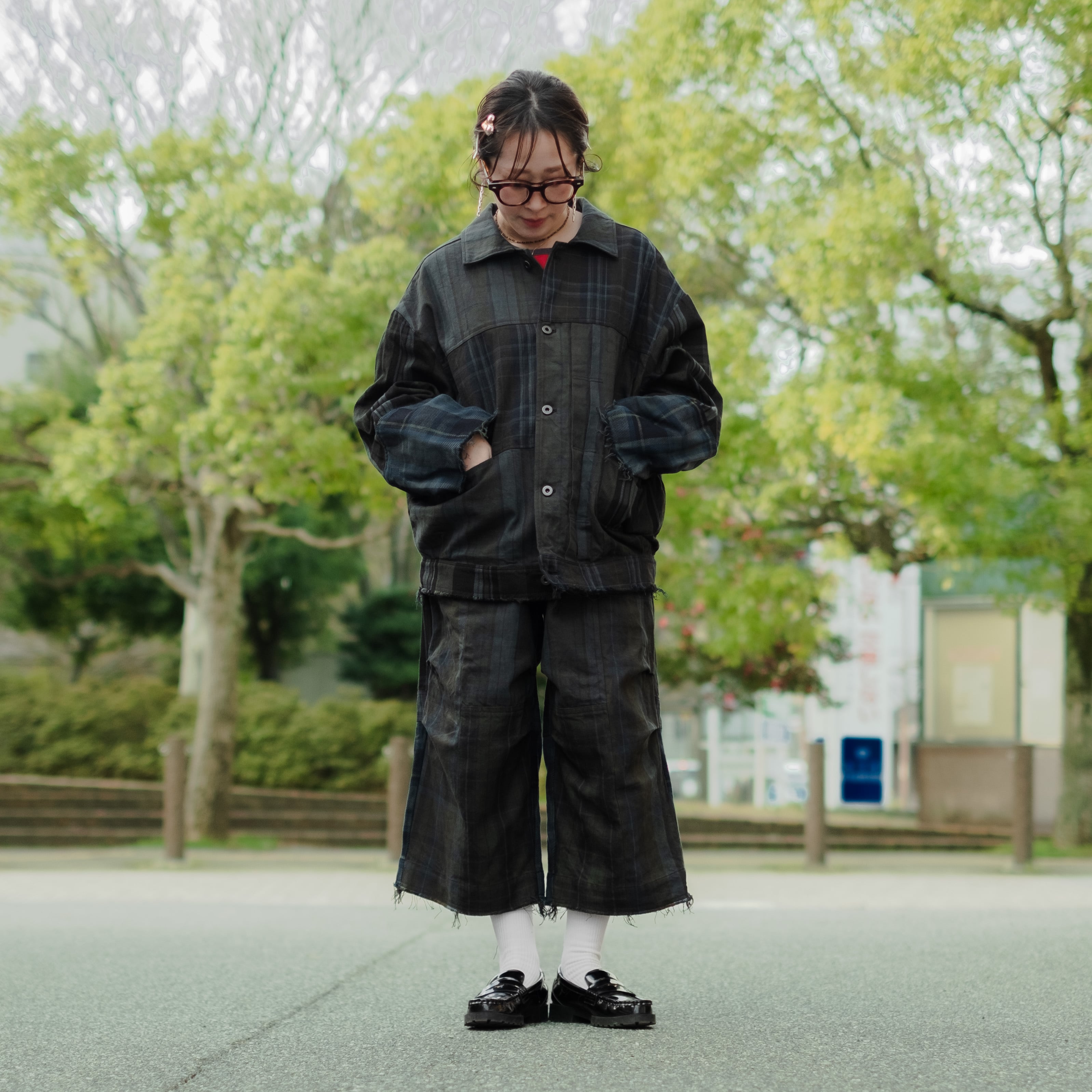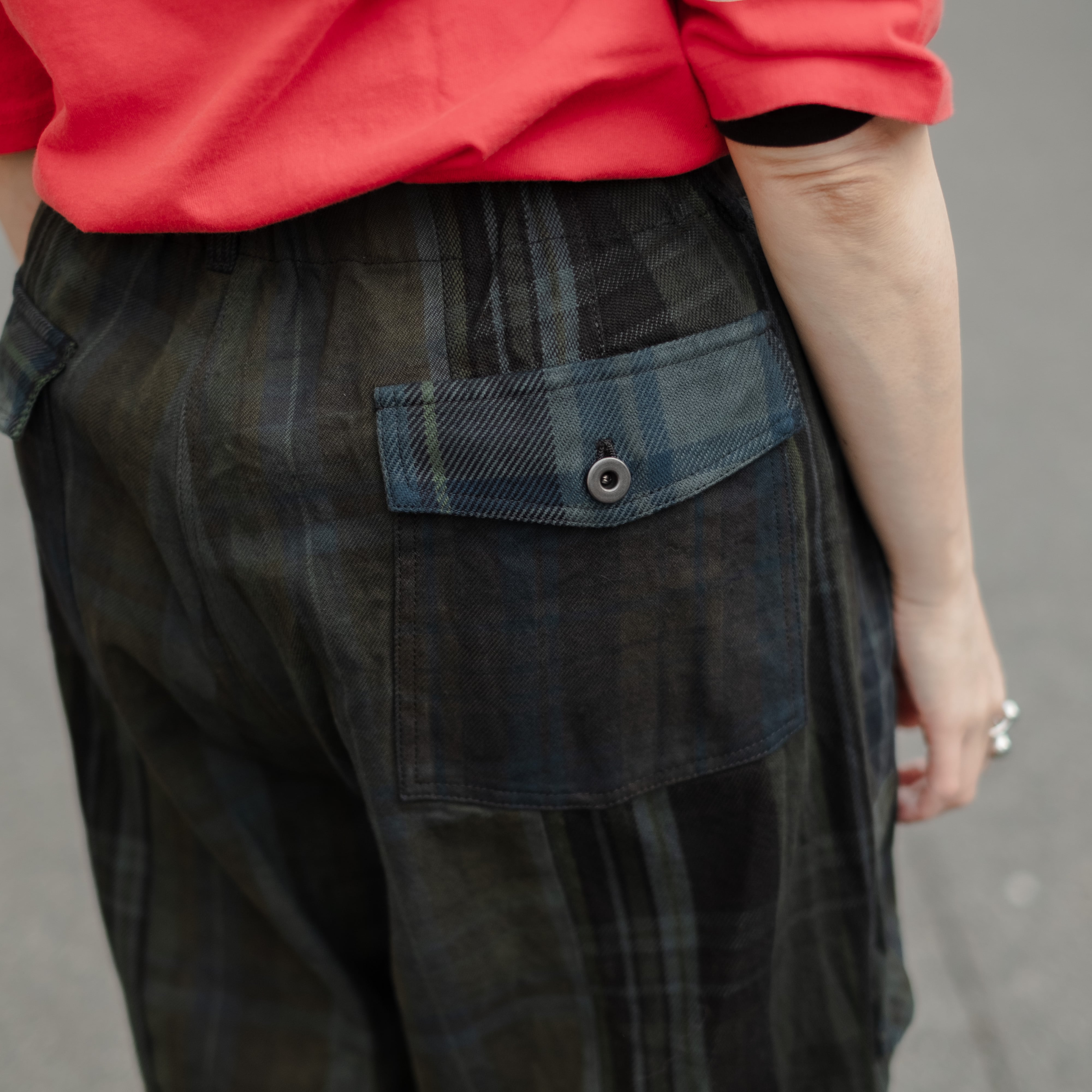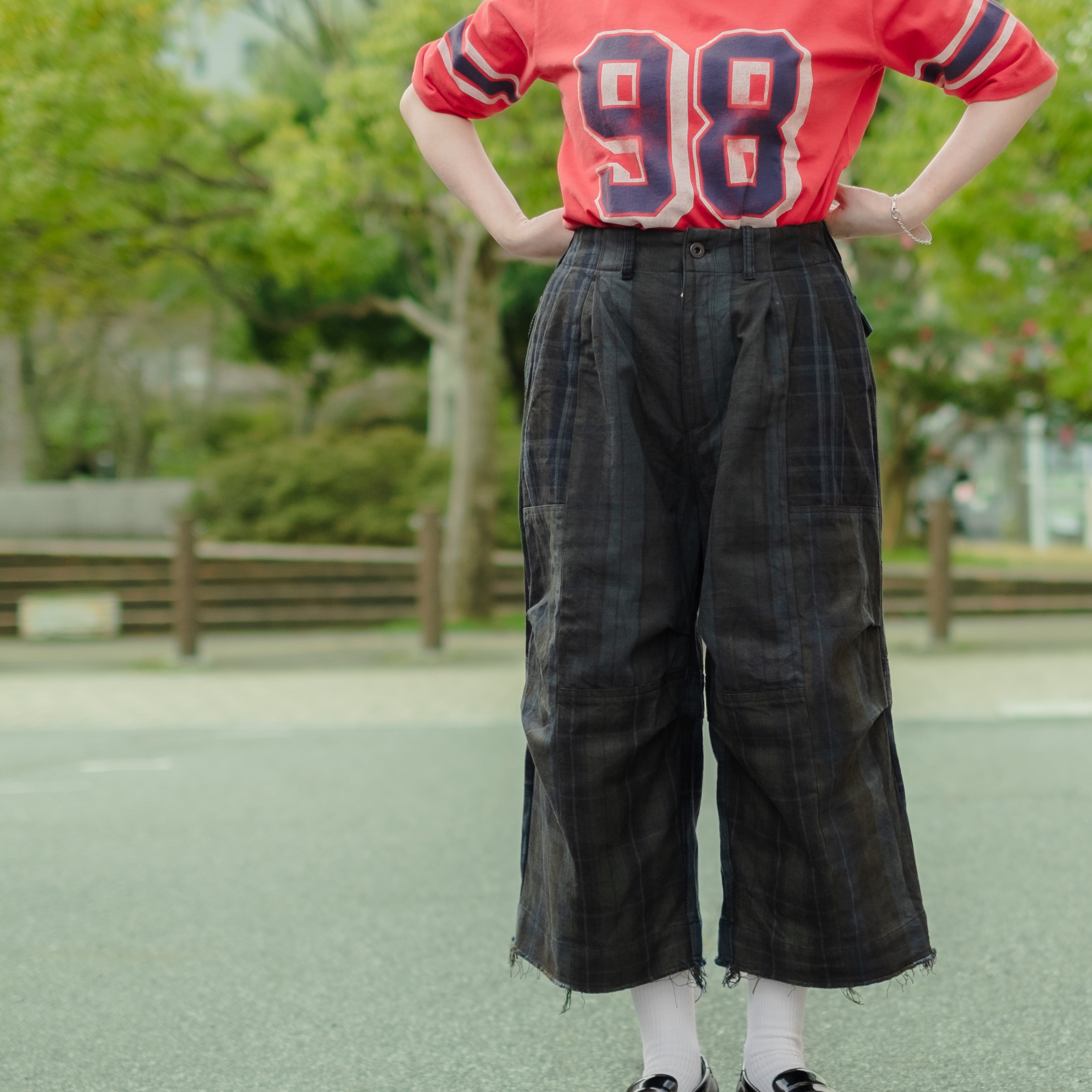 9種類の肉厚で近いチェック素材を用いて制作し、うっすらチェック柄が見えるように炭黒に製品染めをして統一感を出したハンパ丈のワイドパンツ。