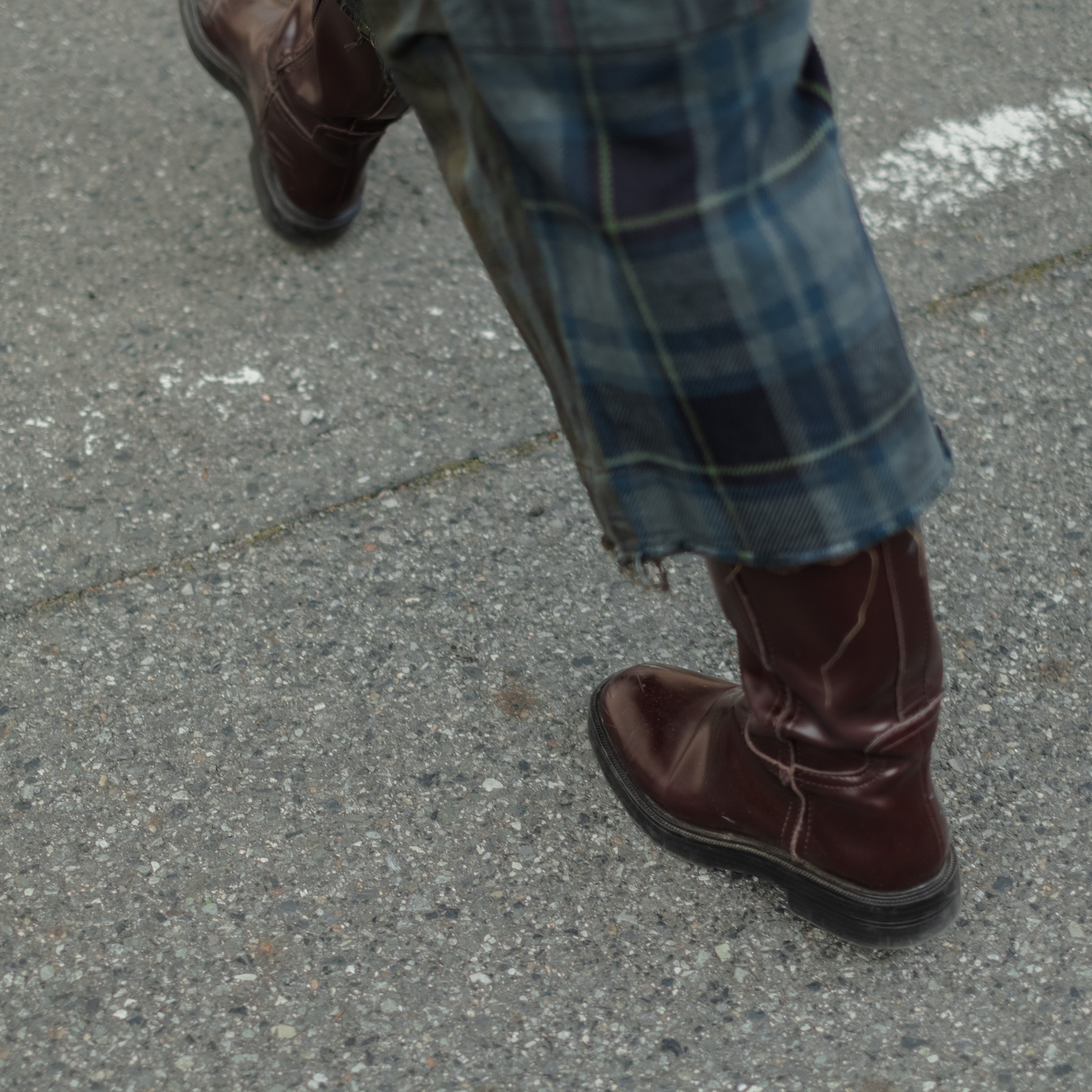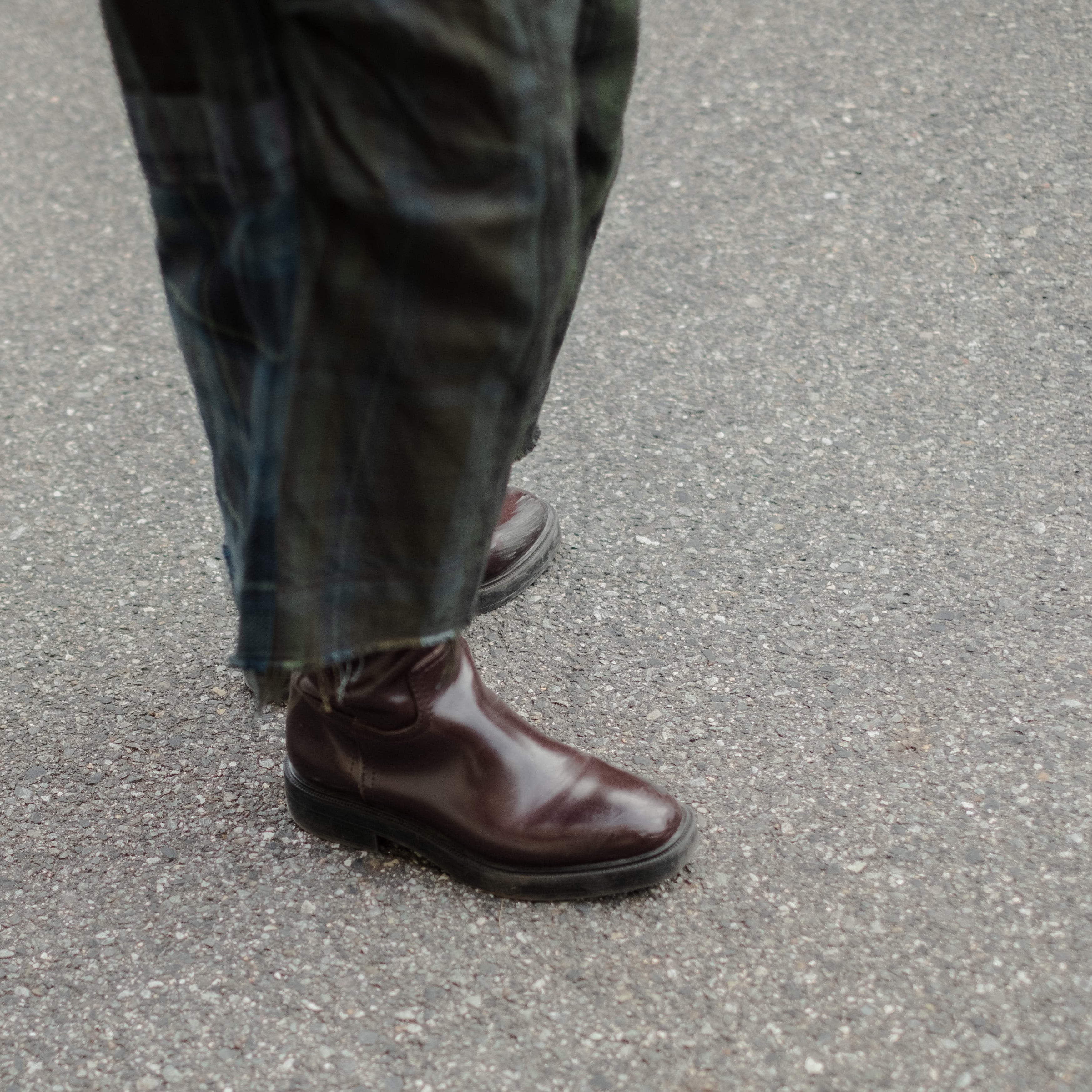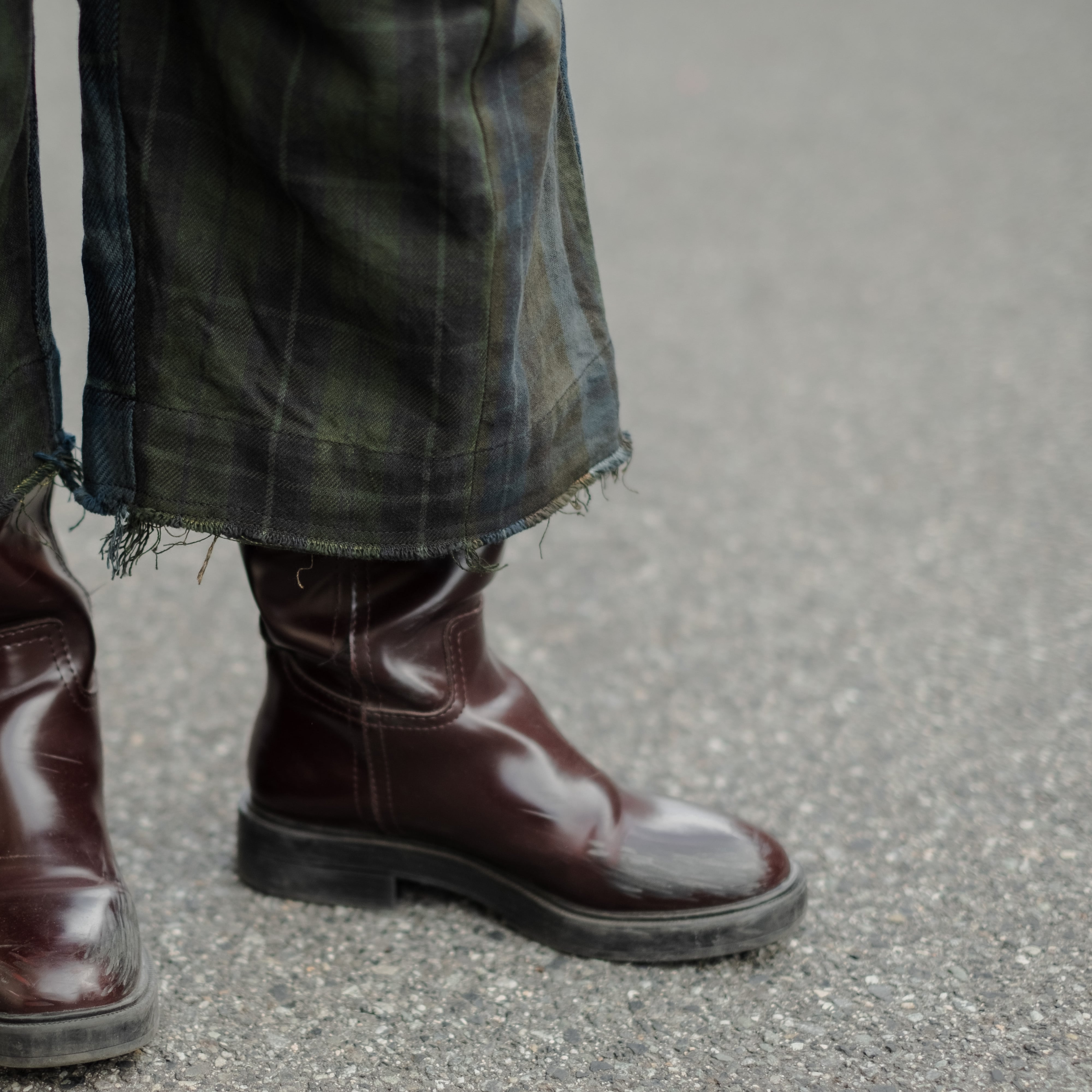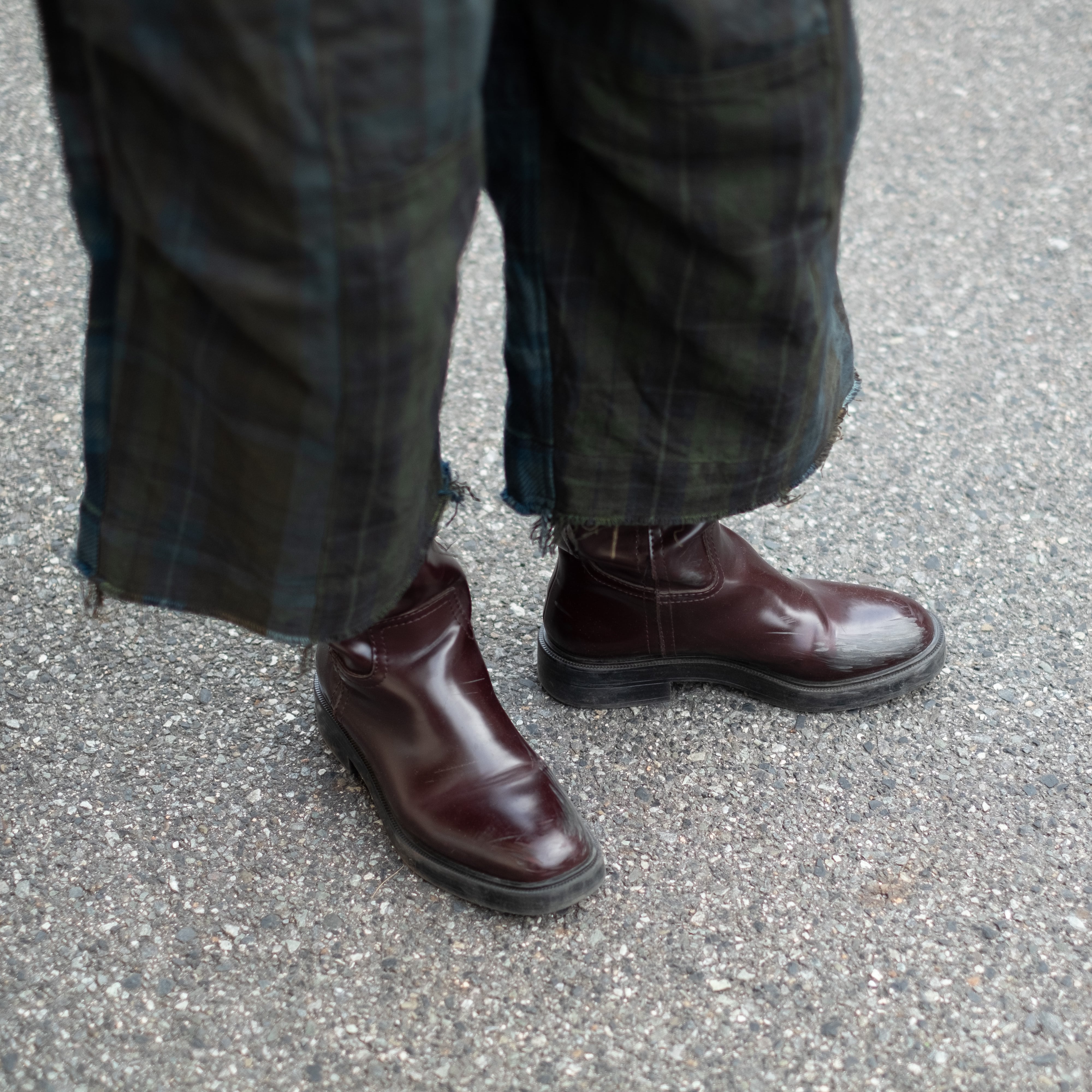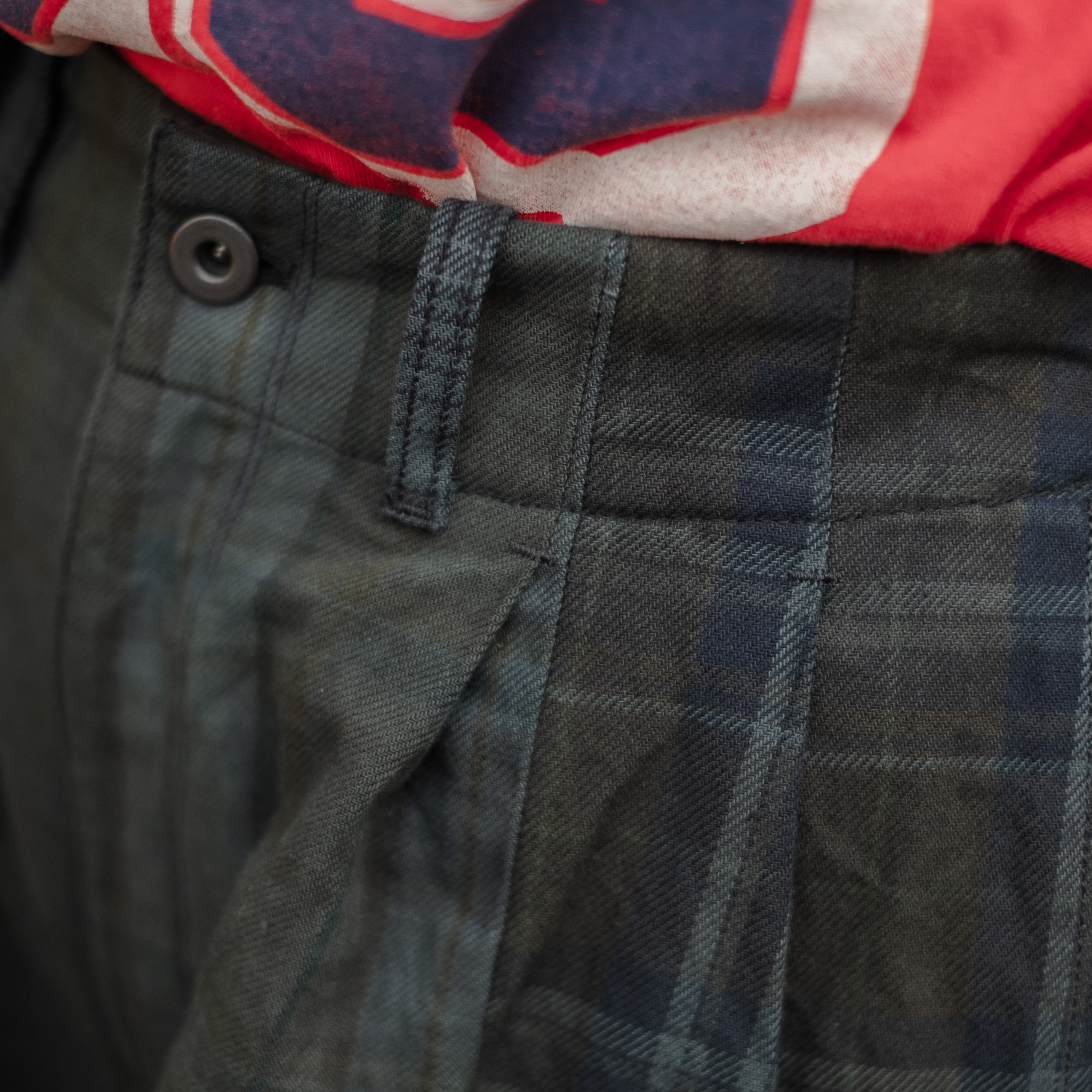 9種類の肉厚で近いチェック素材を用いて制作し、うっすらチェック柄が見えるように炭黒に製品染めをして統一感を出したハンパ丈のワイドパンツ。