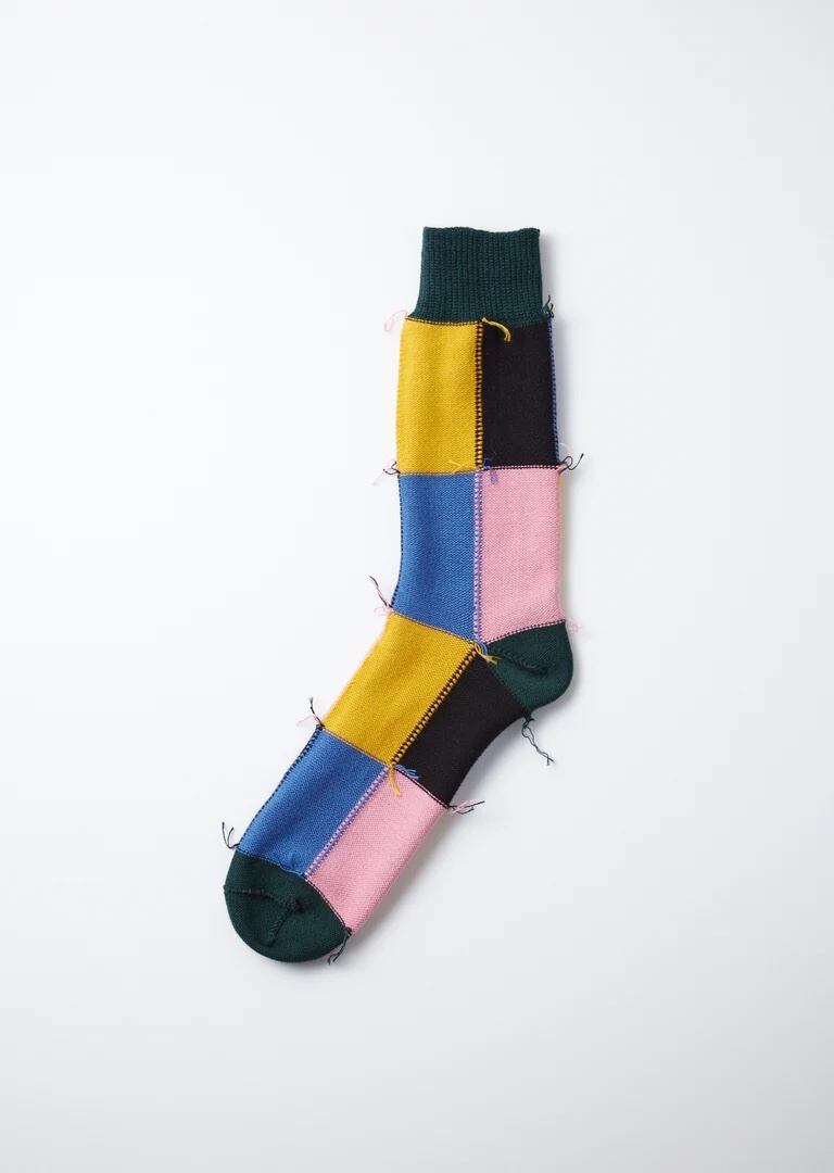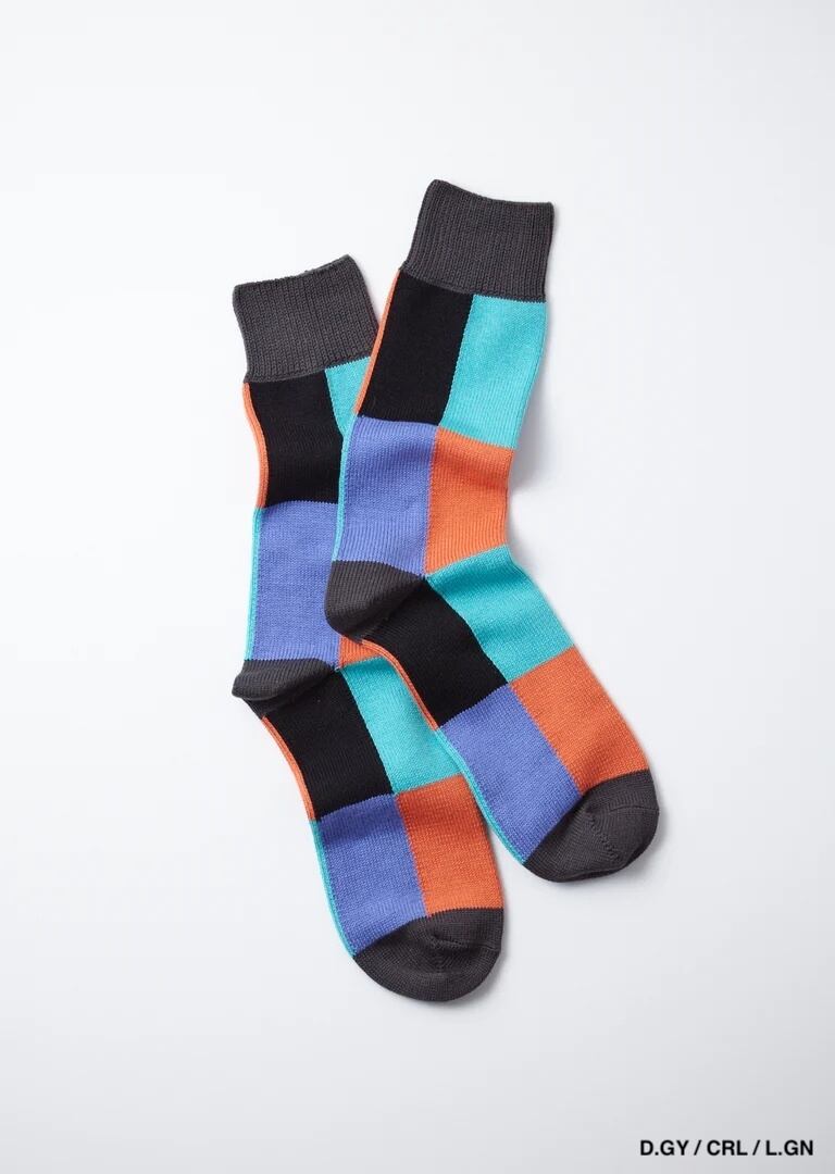 4面のカラーパネルを組み合わせたデザインが特徴のオーガニックコットンソックス。