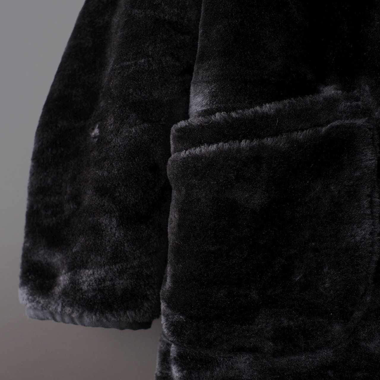 裏面にファーをあしらい、リバーシブル仕様のノーカラージャケット。