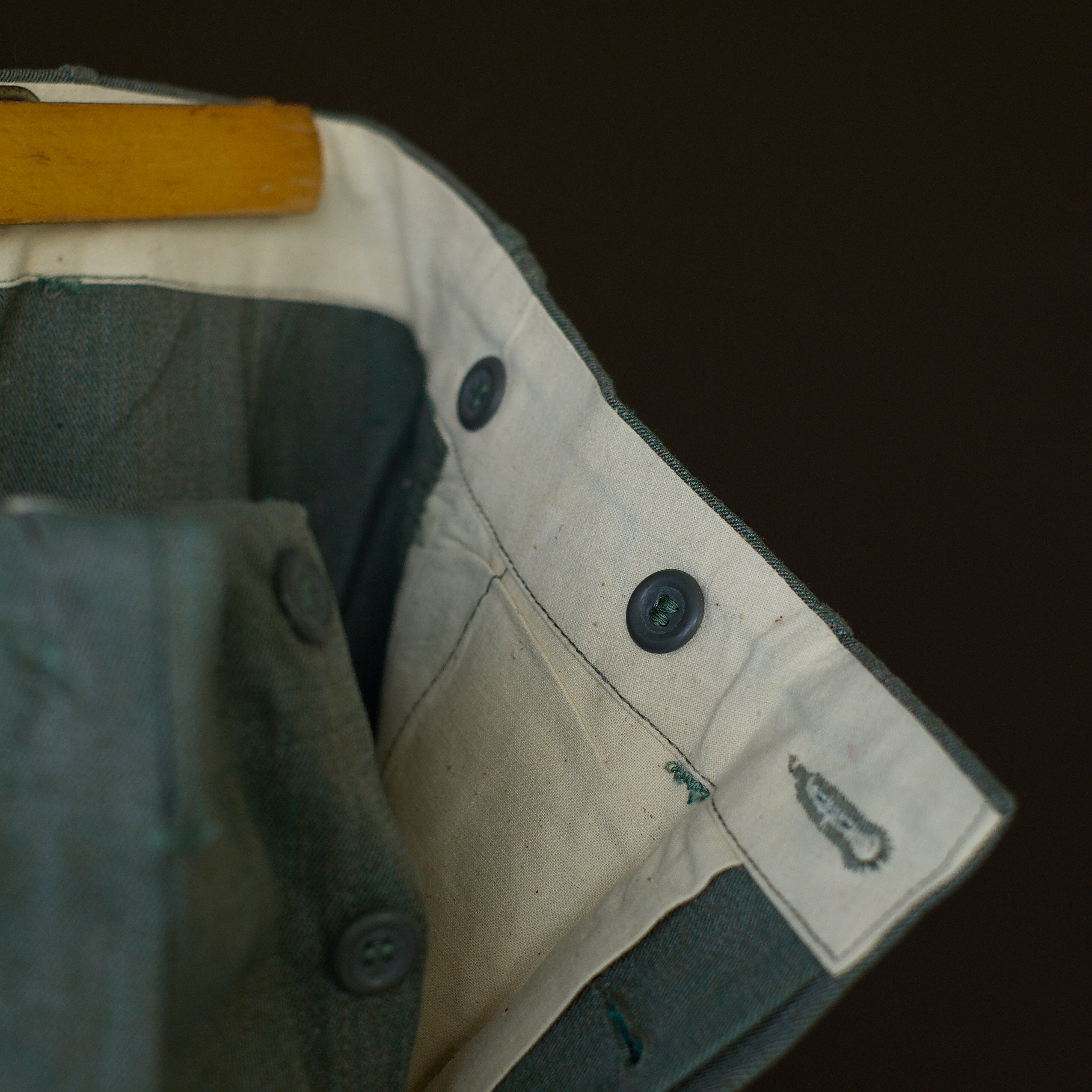 60年代頃まで採用されていたパンツで丈夫なコットンツイル、経糸にはホワイトとブラウンのムラ糸をランダムに使用し、横糸にはグリーン系のムラ糸が使用されており、玉虫色のように見る角度によって色の変化が楽しめる、なかなか見られない独特なカラーのプリズナーパンツです。