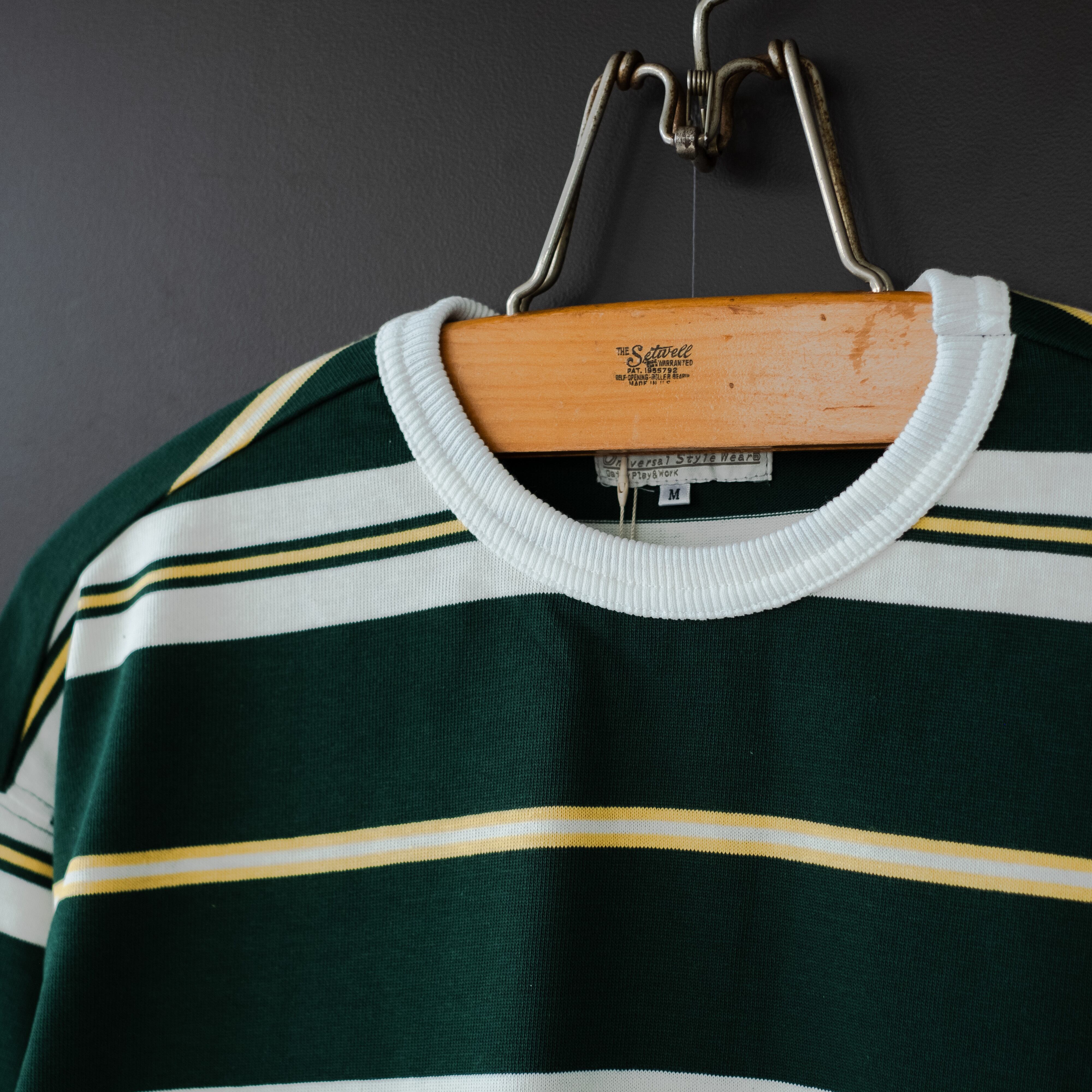 90'sな雰囲気漂う配色が絶妙なボーダー天竺を使用し、衿を白でまとめたリンガー仕様の長袖Tシャツです。
