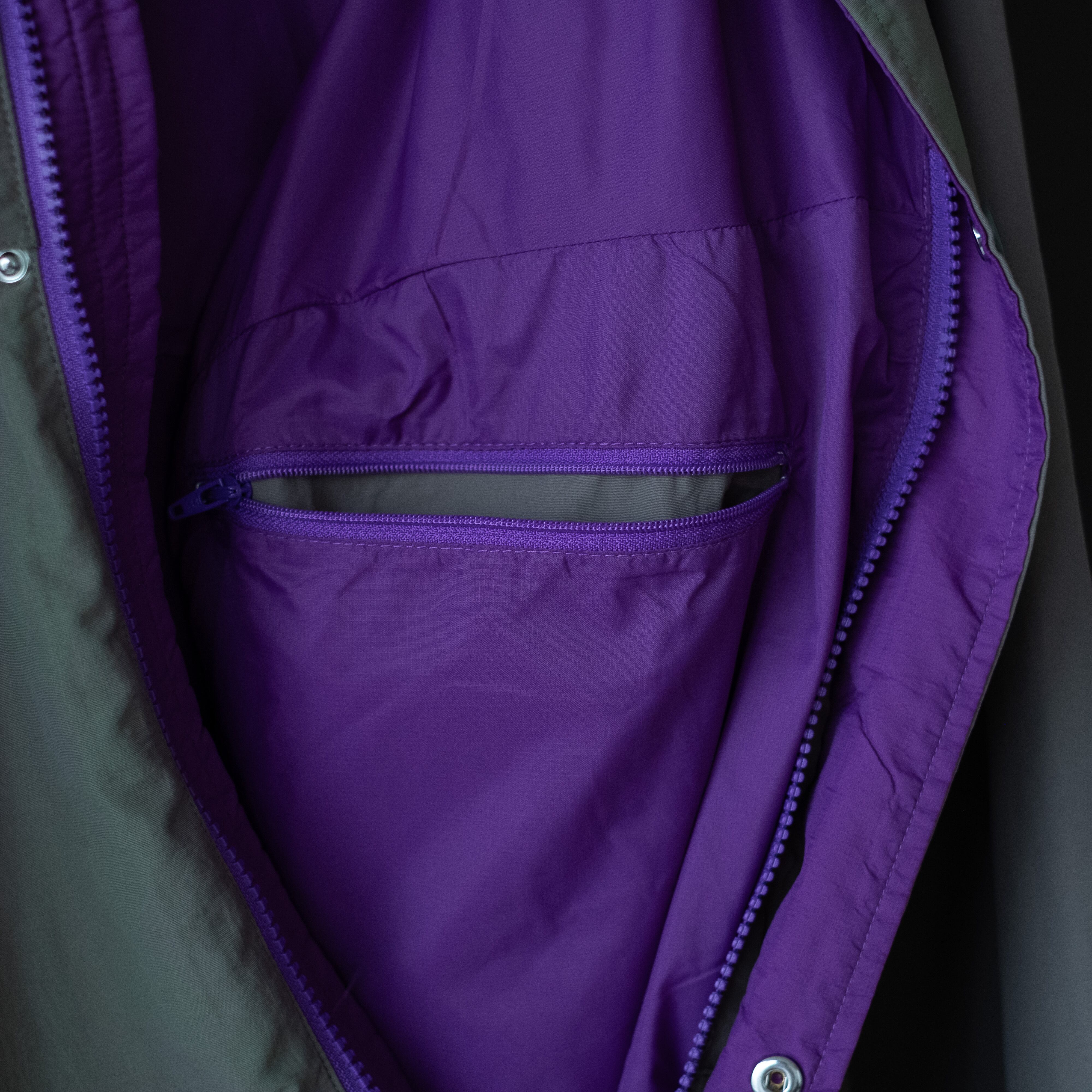 裏地や前たて、ファスナーなどに90年代を彷彿させる配色を施し、デザイン性抜群なレインコートに仕上がっています。