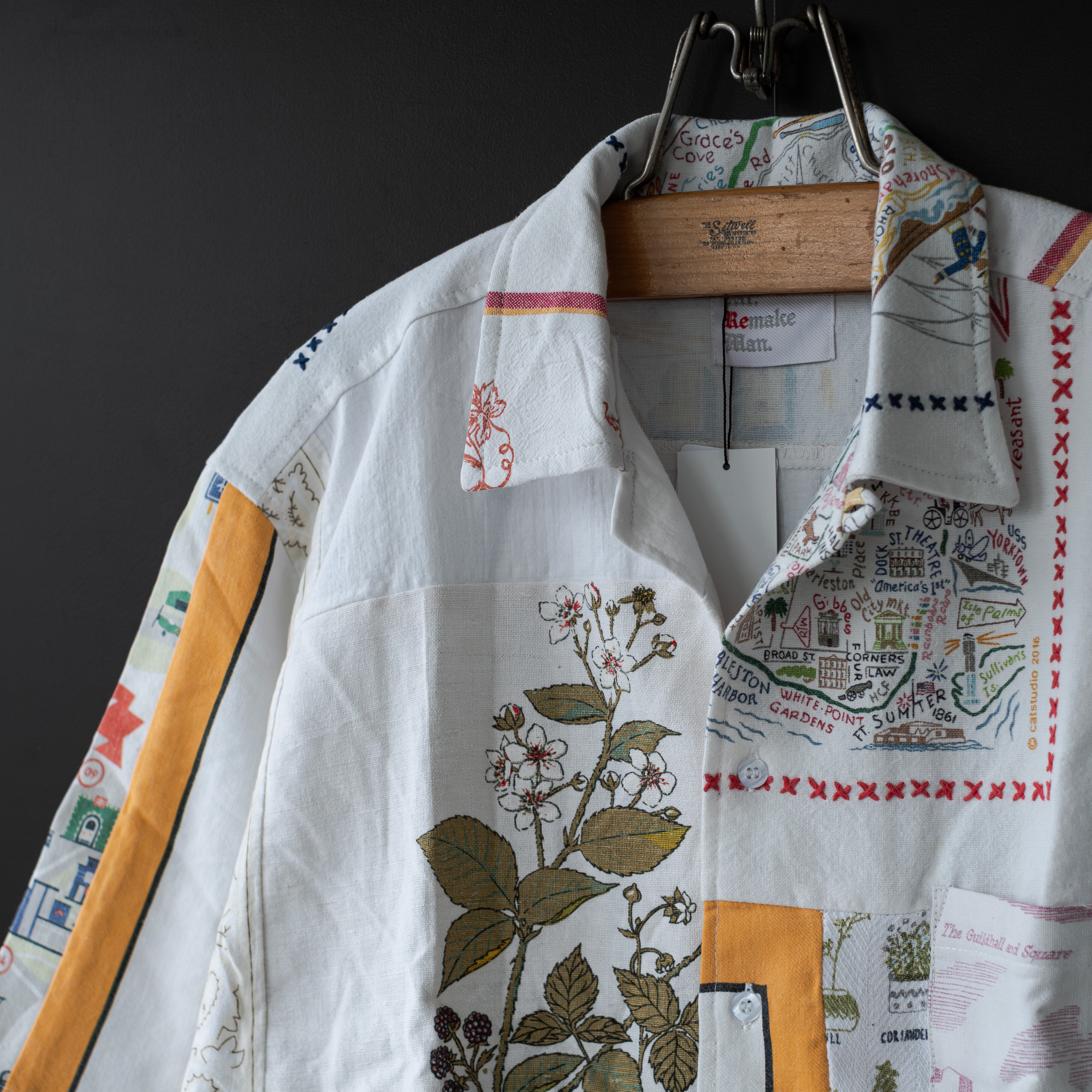 古着のタペストリーを解体、リメイクし、開襟シャツに。