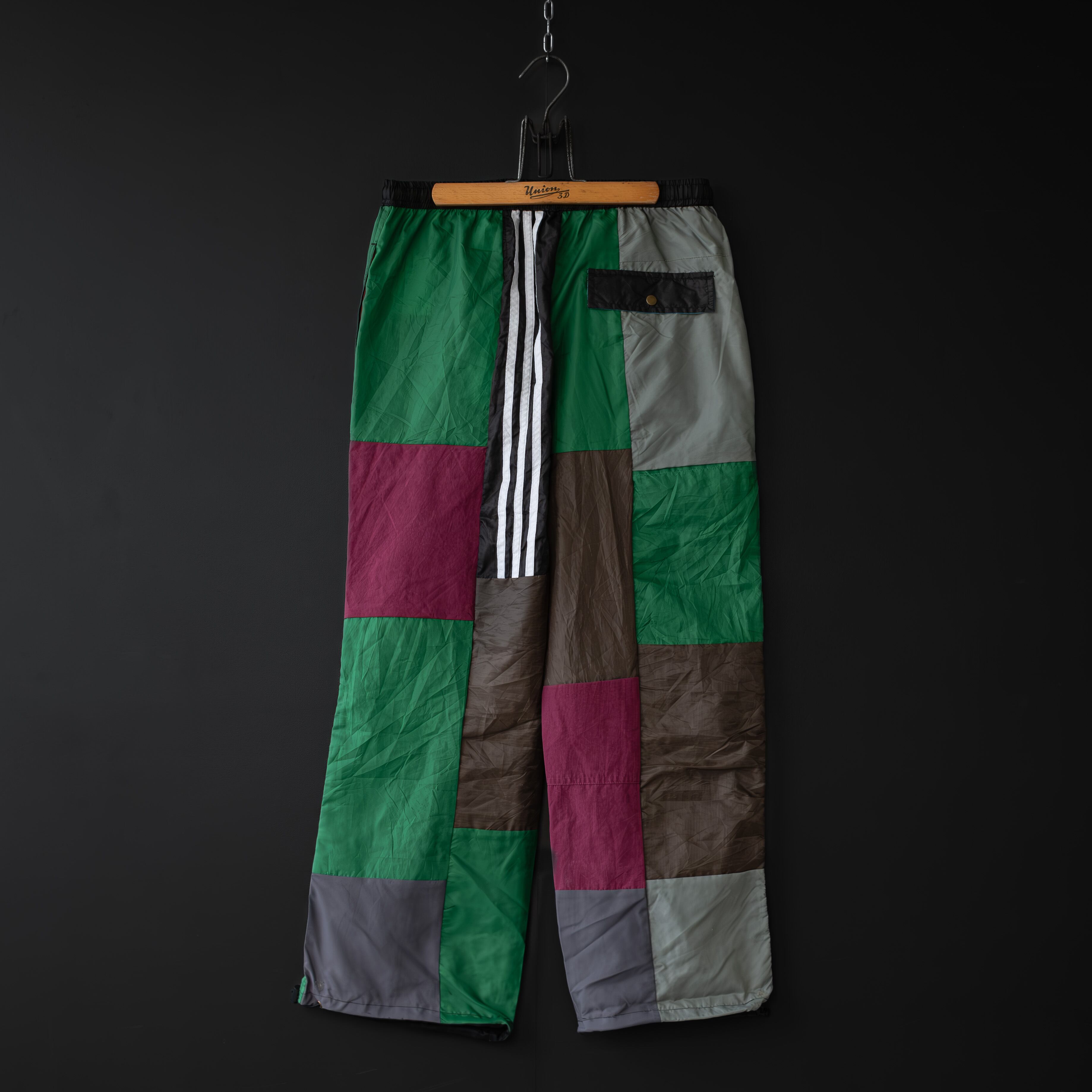 usedのナイロンウェアをバラし、パッチワークにしてイージータイプのパンツに。